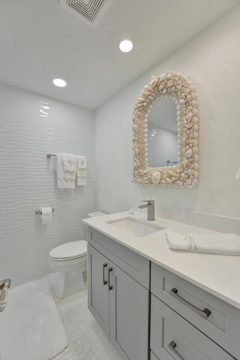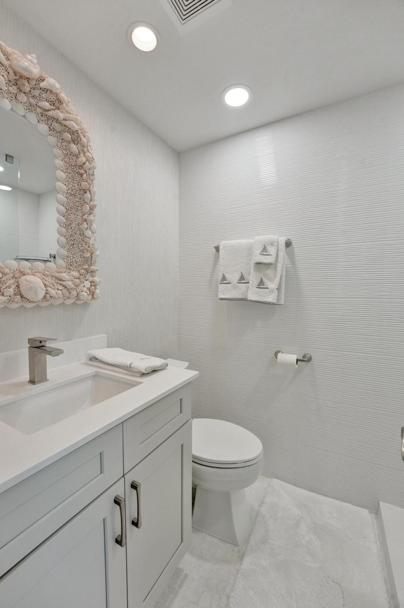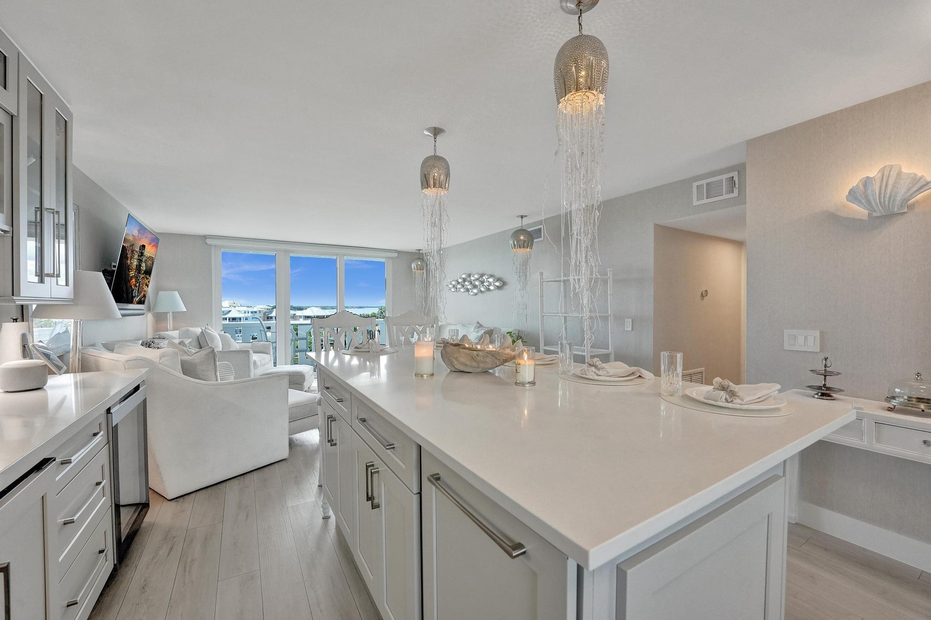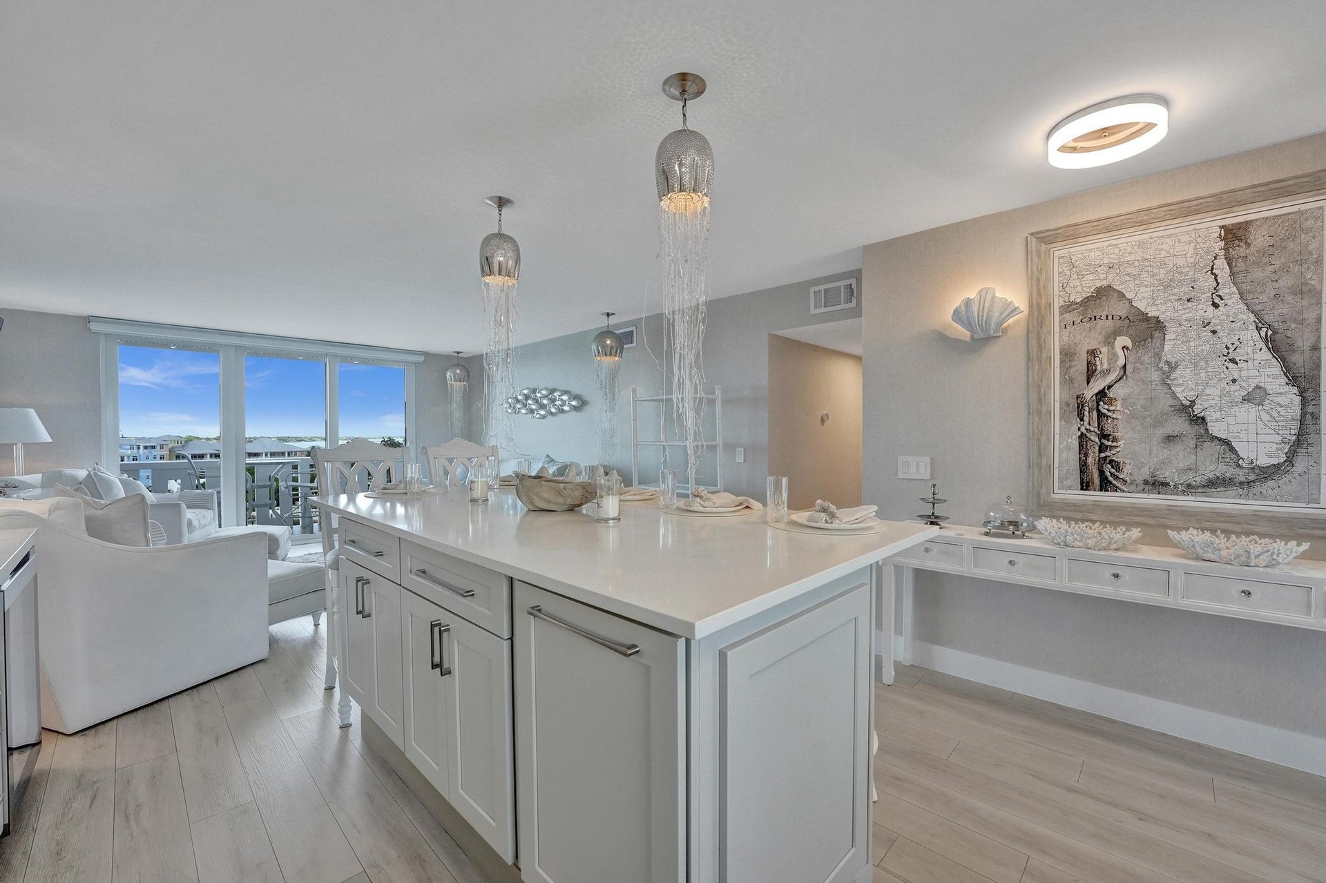 Live the Florida Dream in Style This stunningly renovated 2-bedroom, 2-bathroom condo offers breathtaking panoramic views of the Intracoastal Waterway and the Atlantic Ocean, blending the best of coastal living with modern elegance. Designed by the renowned Palm Beach designer, Jeanne Michelle, every detail of this residence has been meticulously crafted for both style and comfort. Step into a coastal modern oasis, fully furnished and turnkey, ready for immediate enjoyment. The spacious kitchen, perfect for entertaining, features a large island and striking jellyfish pendant lights, while grasscloth wallpaper and charming shell sconces create a welcoming atmosphere. With impact windows throughout and remote-controlled blinds, you'll enjoy both beautiful views and comfort.