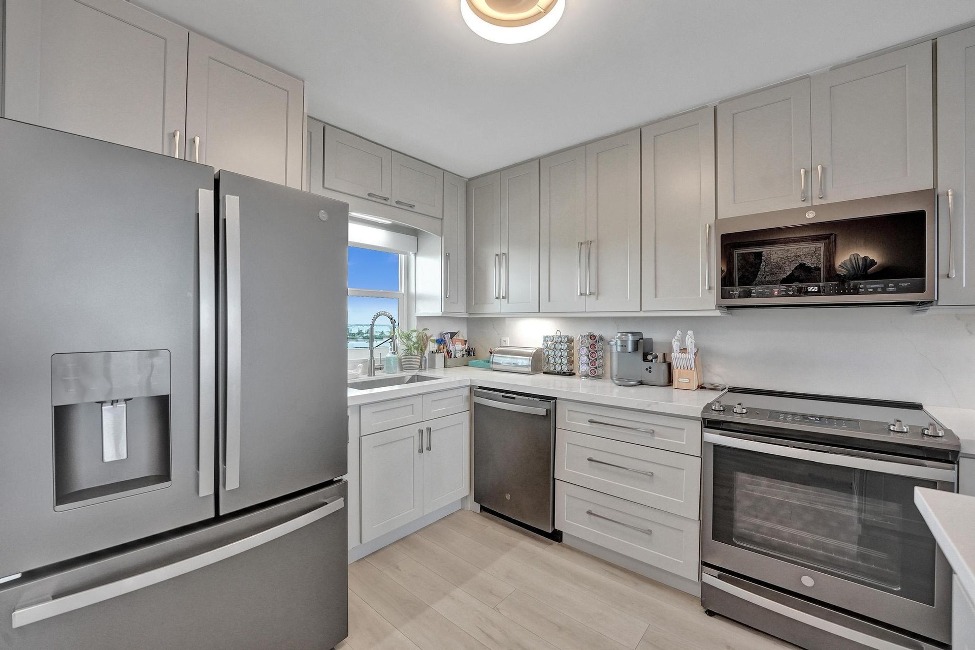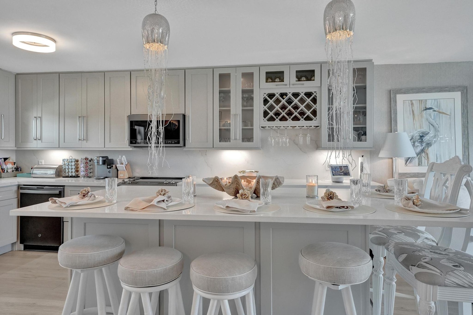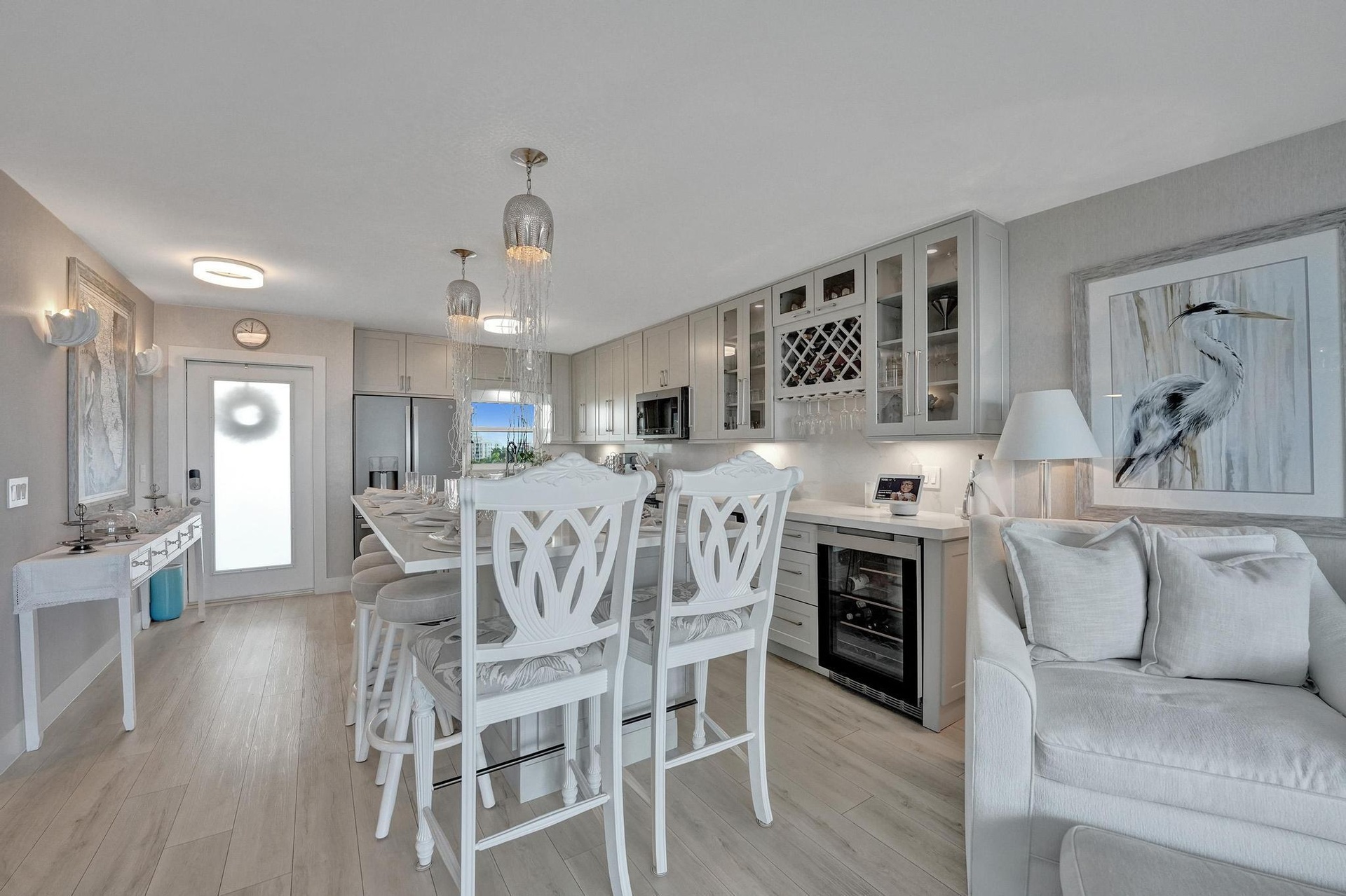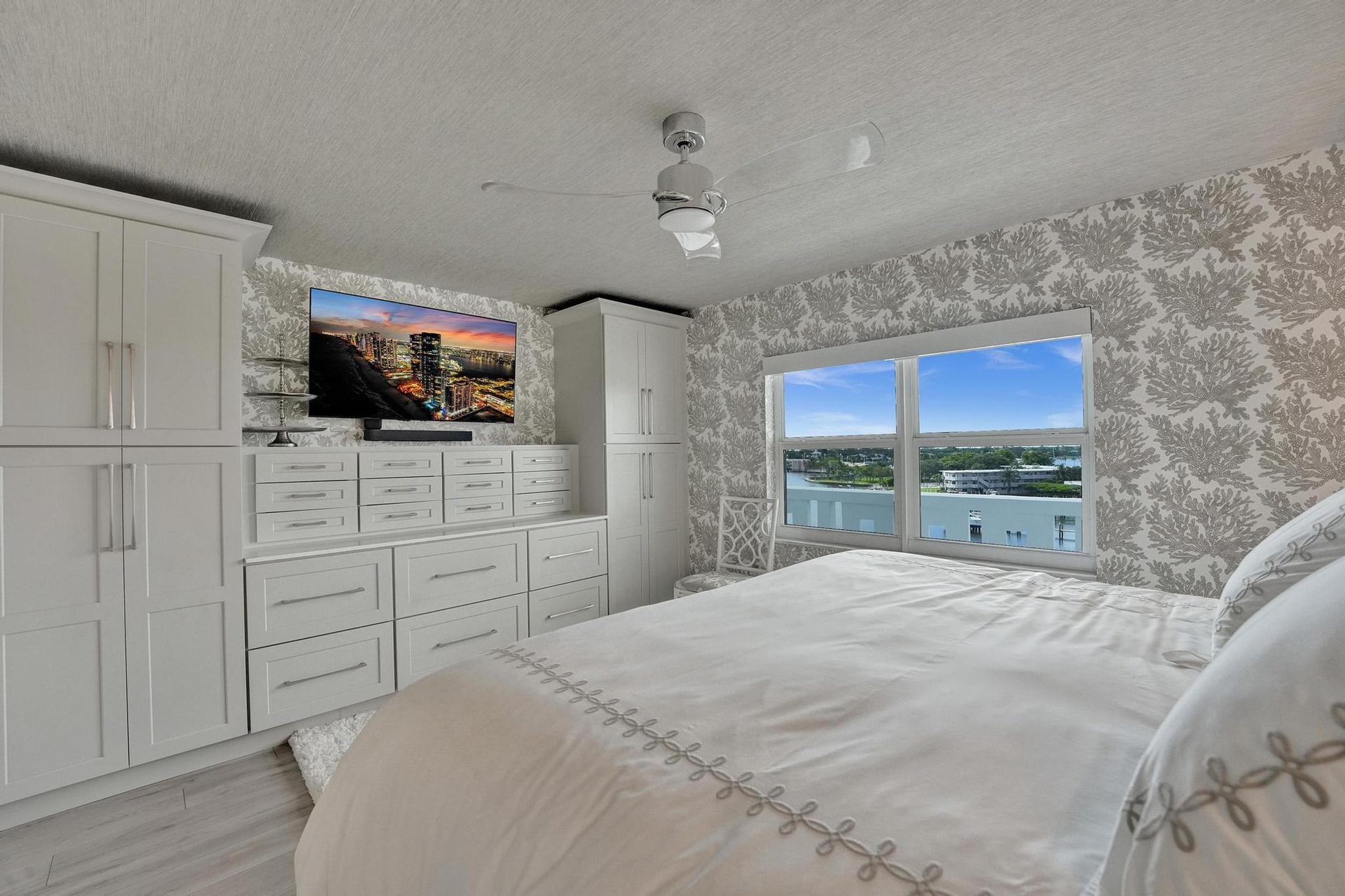 Live the Florida Dream in Style This stunningly renovated 2-bedroom, 2-bathroom condo offers breathtaking panoramic views of the Intracoastal Waterway and the Atlantic Ocean, blending the best of coastal living with modern elegance. Designed by the renowned Palm Beach designer, Jeanne Michelle, every detail of this residence has been meticulously crafted for both style and comfort. Step into a coastal modern oasis, fully furnished and turnkey, ready for immediate enjoyment. The spacious kitchen, perfect for entertaining, features a large island and striking jellyfish pendant lights, while grasscloth wallpaper and charming shell sconces create a welcoming atmosphere. With impact windows throughout and remote-controlled blinds, you'll enjoy both beautiful views and comfort.