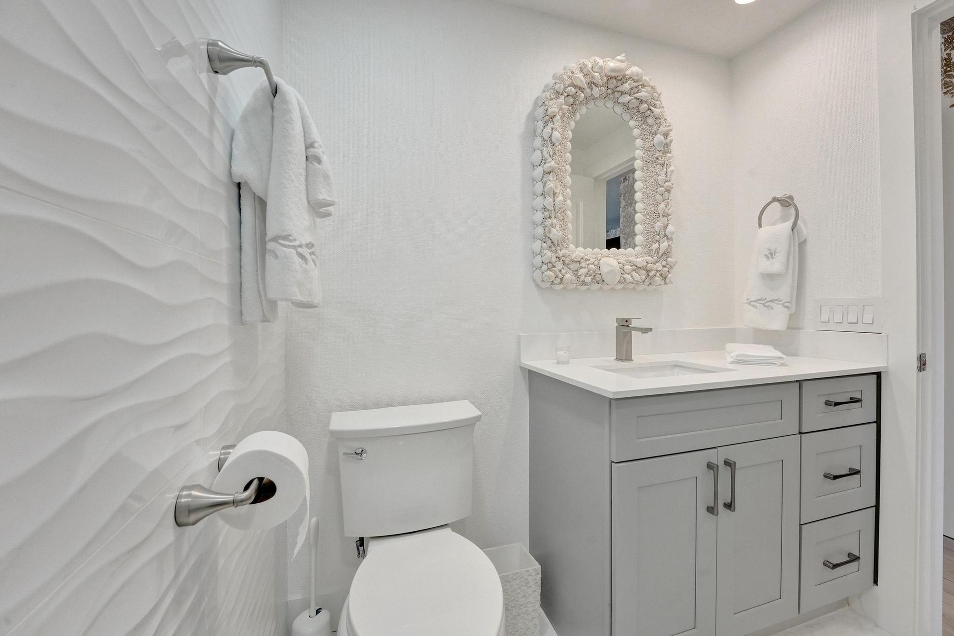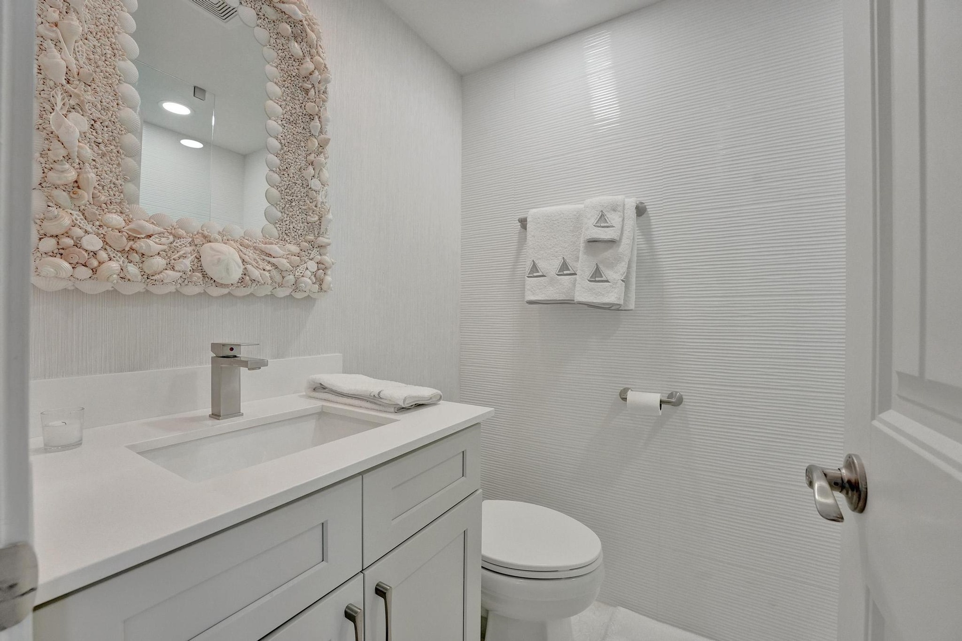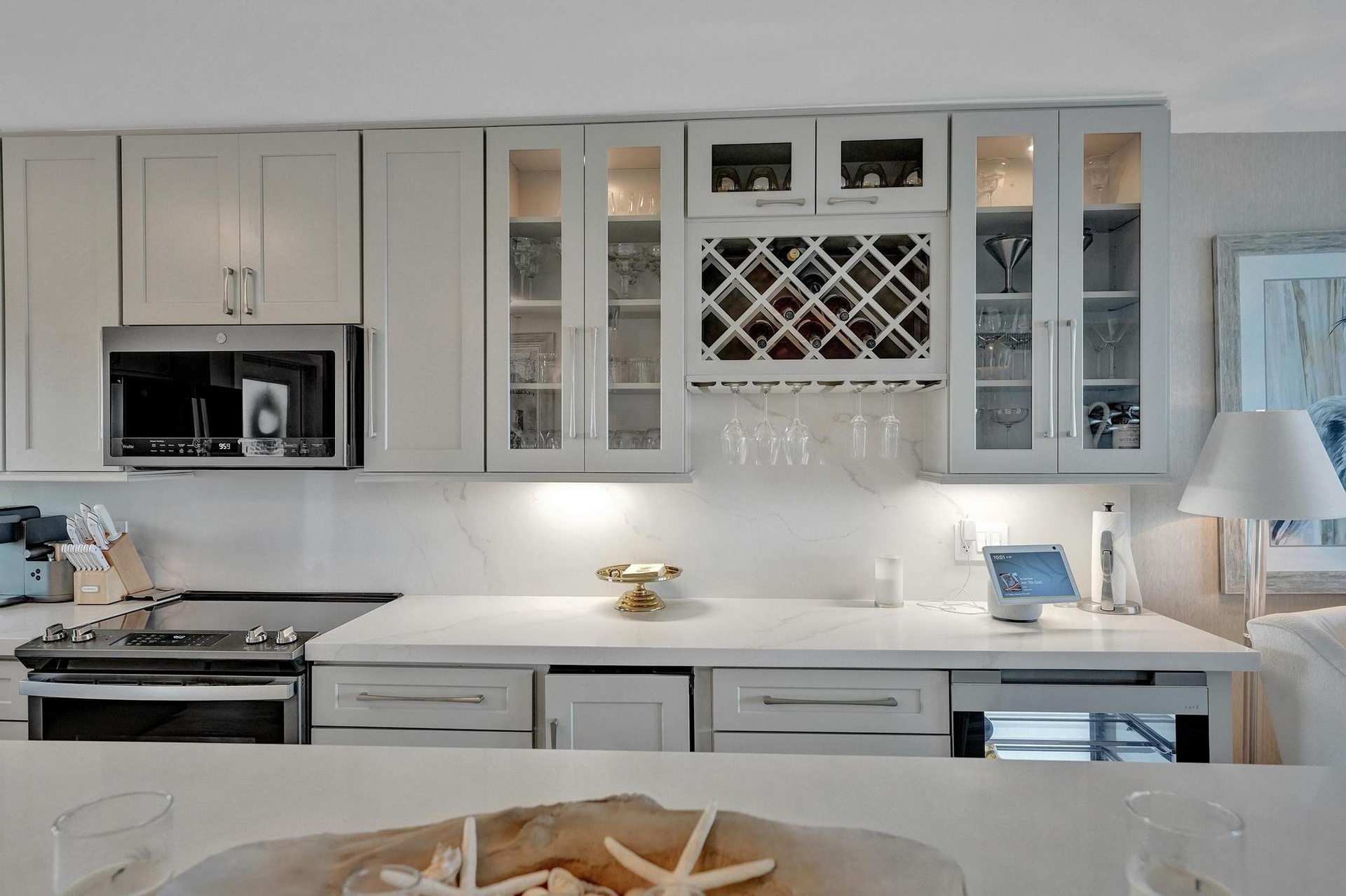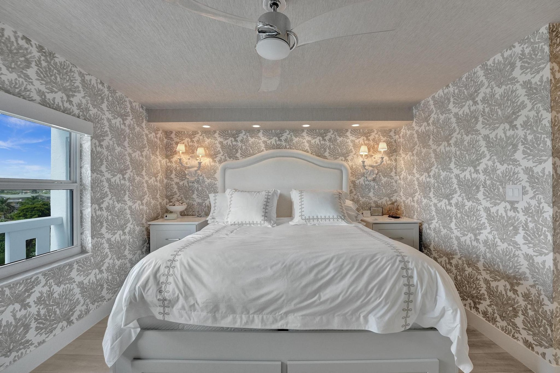 Live the Florida Dream in Style This stunningly renovated 2-bedroom, 2-bathroom condo offers breathtaking panoramic views of the Intracoastal Waterway and the Atlantic Ocean, blending the best of coastal living with modern elegance. Designed by the renowned Palm Beach designer, Jeanne Michelle, every detail of this residence has been meticulously crafted for both style and comfort. Step into a coastal modern oasis, fully furnished and turnkey, ready for immediate enjoyment. The spacious kitchen, perfect for entertaining, features a large island and striking jellyfish pendant lights, while grasscloth wallpaper and charming shell sconces create a welcoming atmosphere. With impact windows throughout and remote-controlled blinds, you'll enjoy both beautiful views and comfort.