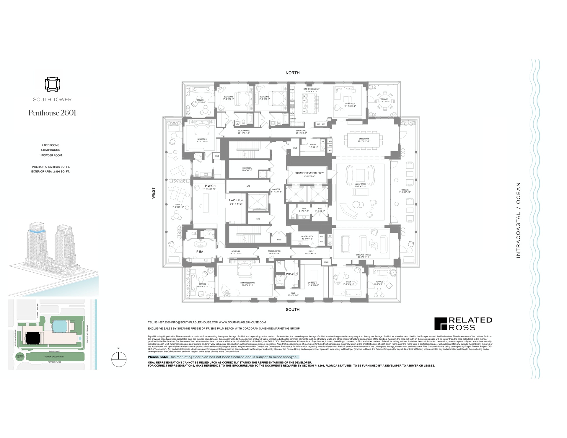 South Tower Penthouse 2601 at South Flagler House is an unparalleled waterfront residence offering 4 BR, 5.1 BA with over 2,000 sq. ft. of private terraces. A private elevator opens to a soaring great room with panoramic views of the Intracoastal, Palm Beach Island, and the Atlantic Ocean. Designed for effortless entertaining, the home features a formal dining room, corner den, and expansive outdoor living. The primary suite is a true sanctuary with dual baths, dual closets, and its own terrace. With a sunlit kitchen, butler's pantry, wet bar, and generous secondary suites, this penthouse captures the essence of Palm Beach living in the sky.