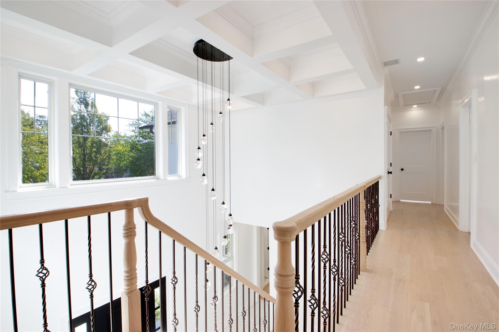 - Hall with beam ceiling, coffered ceiling, wood finished floors, and crown molding