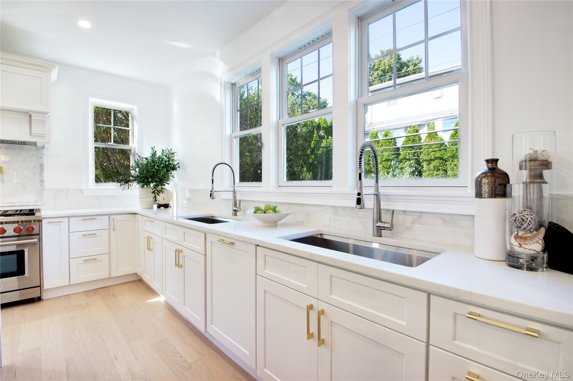 - Kitchen featuring double oven range, white cabinetry, light stone counters, and recessed lighting