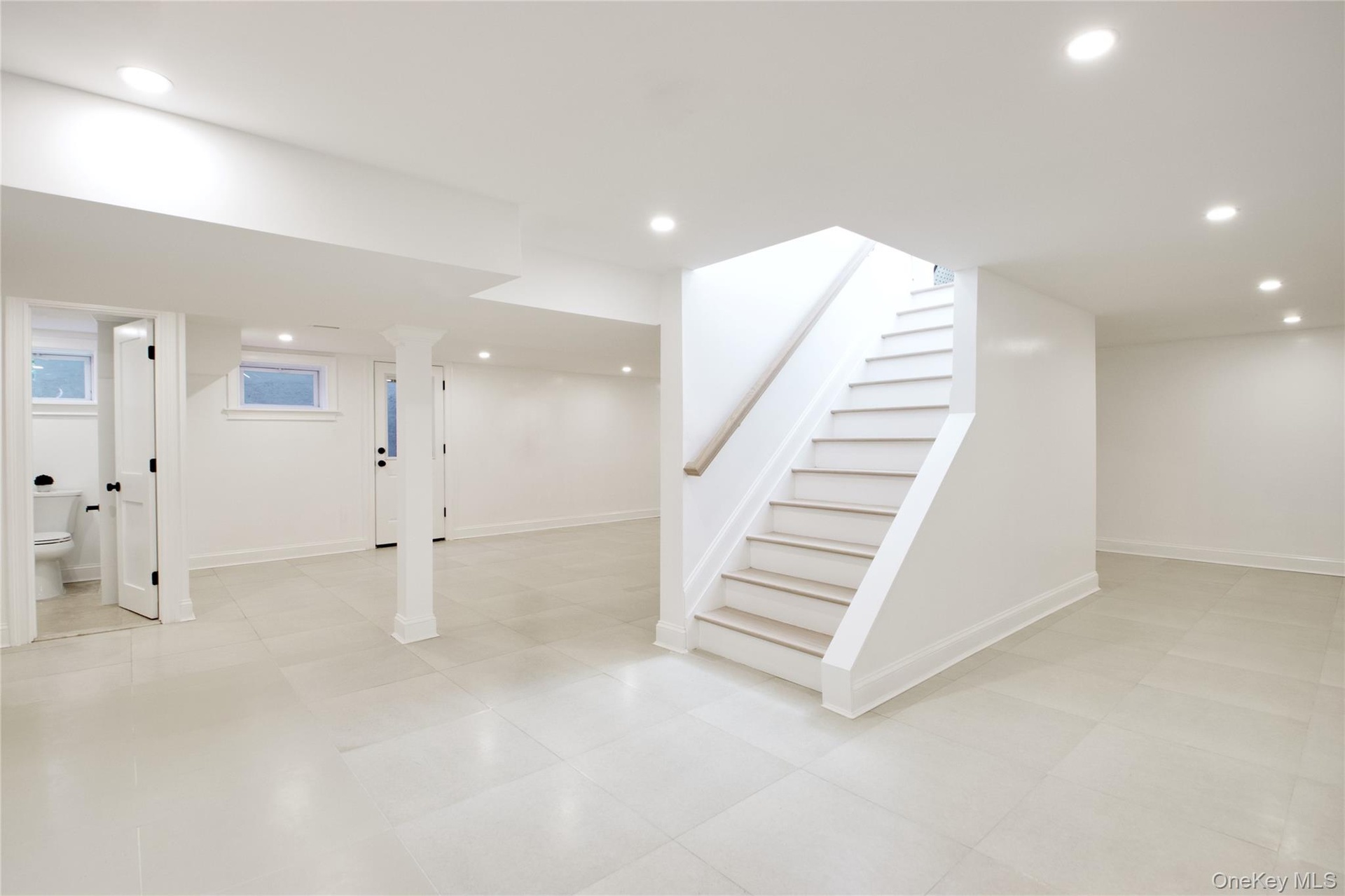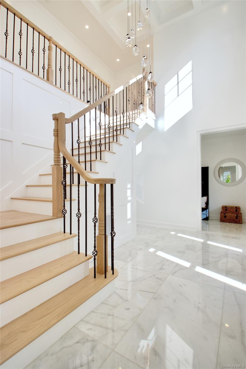 - Staircase with marble tiled floors, a high ceiling, recessed lighting, and beam ceiling