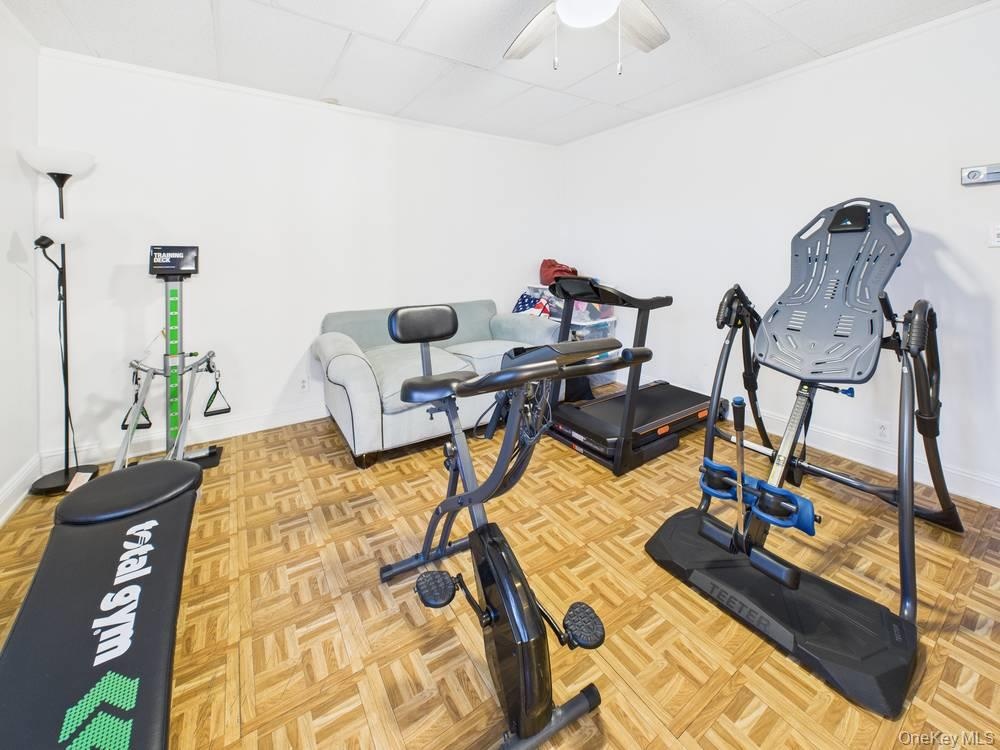 - Exercise area featuring a ceiling fan and a drop ceiling