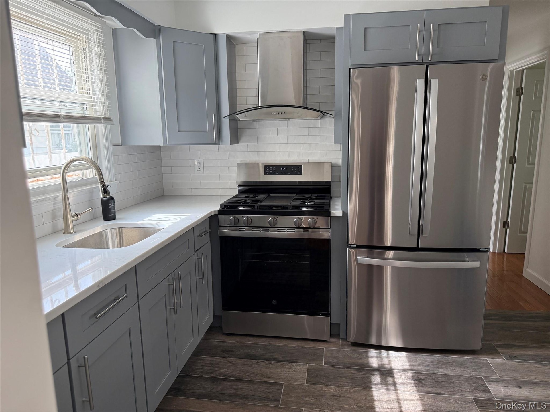 - Kitchen with gray cabinetry, appliances with stainless steel finishes, wall chimney range hood, decorative backsplash, and light stone countertops
