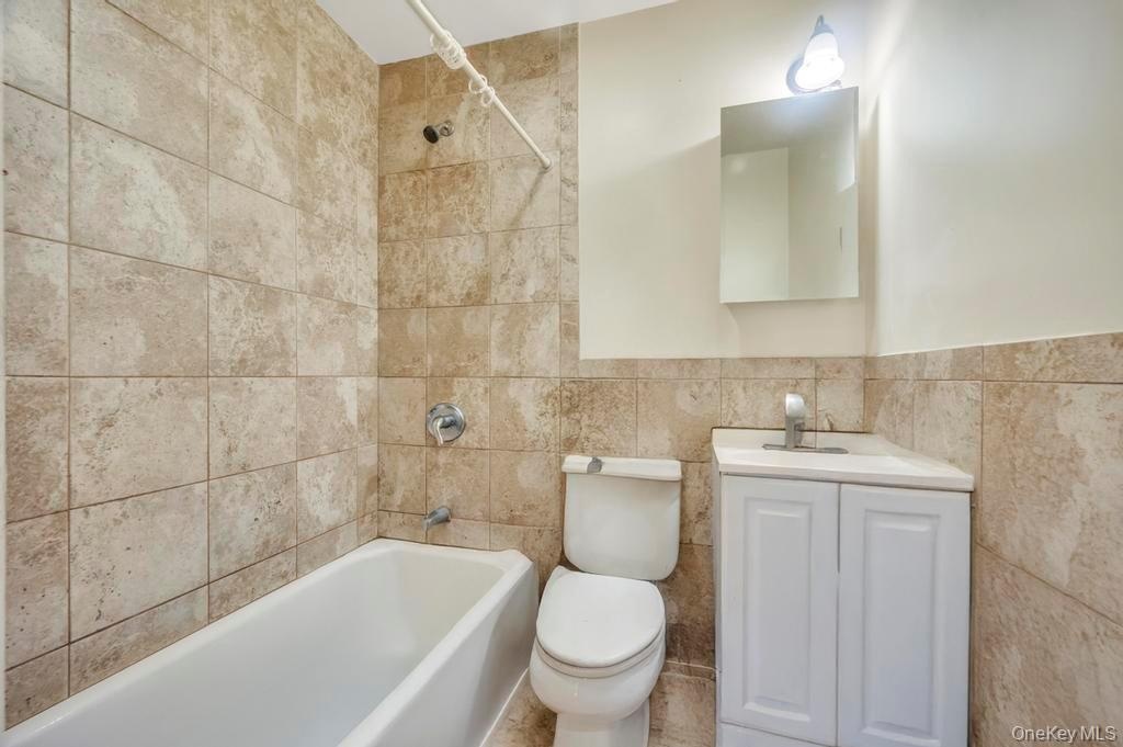 - Bathroom featuring tasteful backsplash, enclosed tub / shower combo, vanity, and tile walls