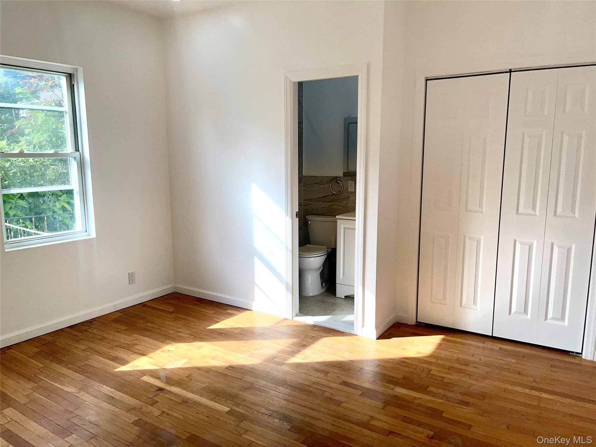 - Unfurnished bedroom with light wood-style floors, connected bathroom, and a closet