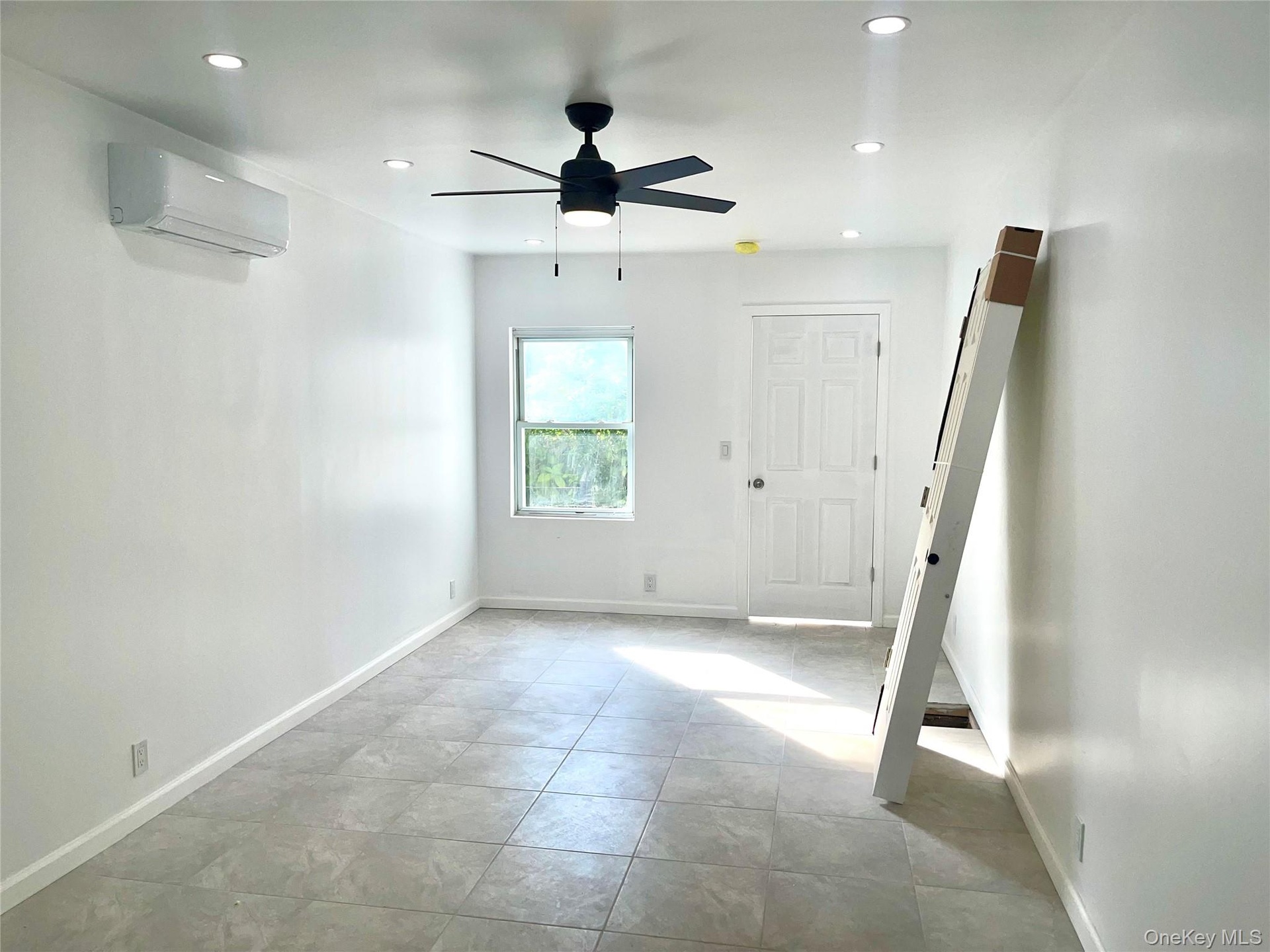 - Living or dinning room featuring a wall mounted AC, recessed lighting, and a ceiling fan