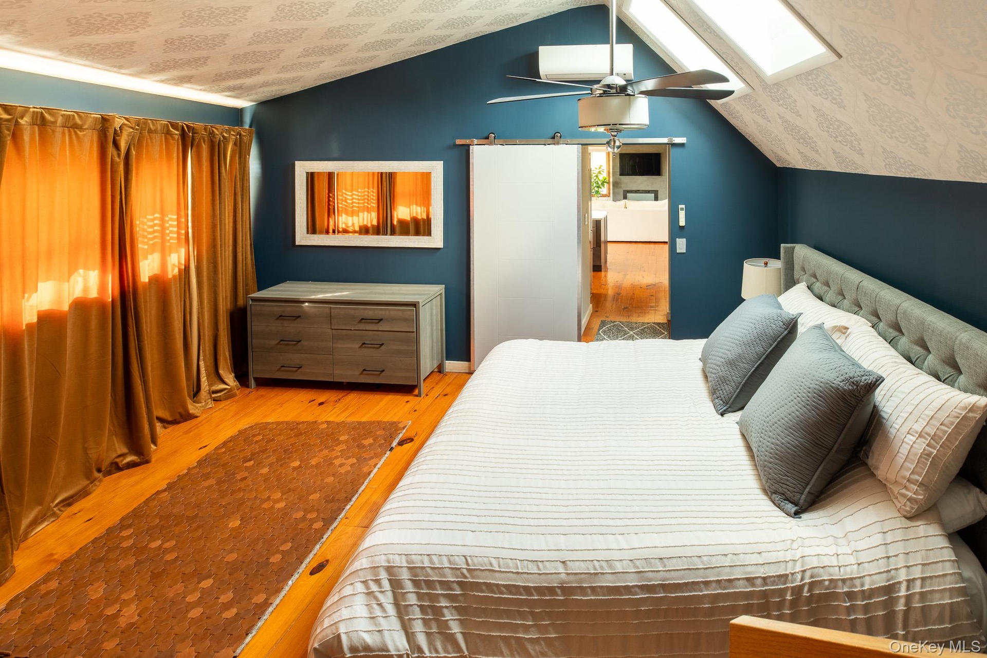 - Bedroom with wood finished floors, vaulted ceiling, a wall unit AC, a ceiling fan, and a skylight