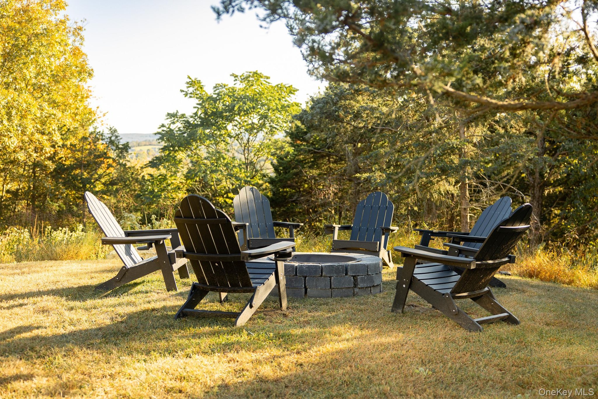 - View of grassy yard with an outdoor fire pit, a patio, and view of wooded area