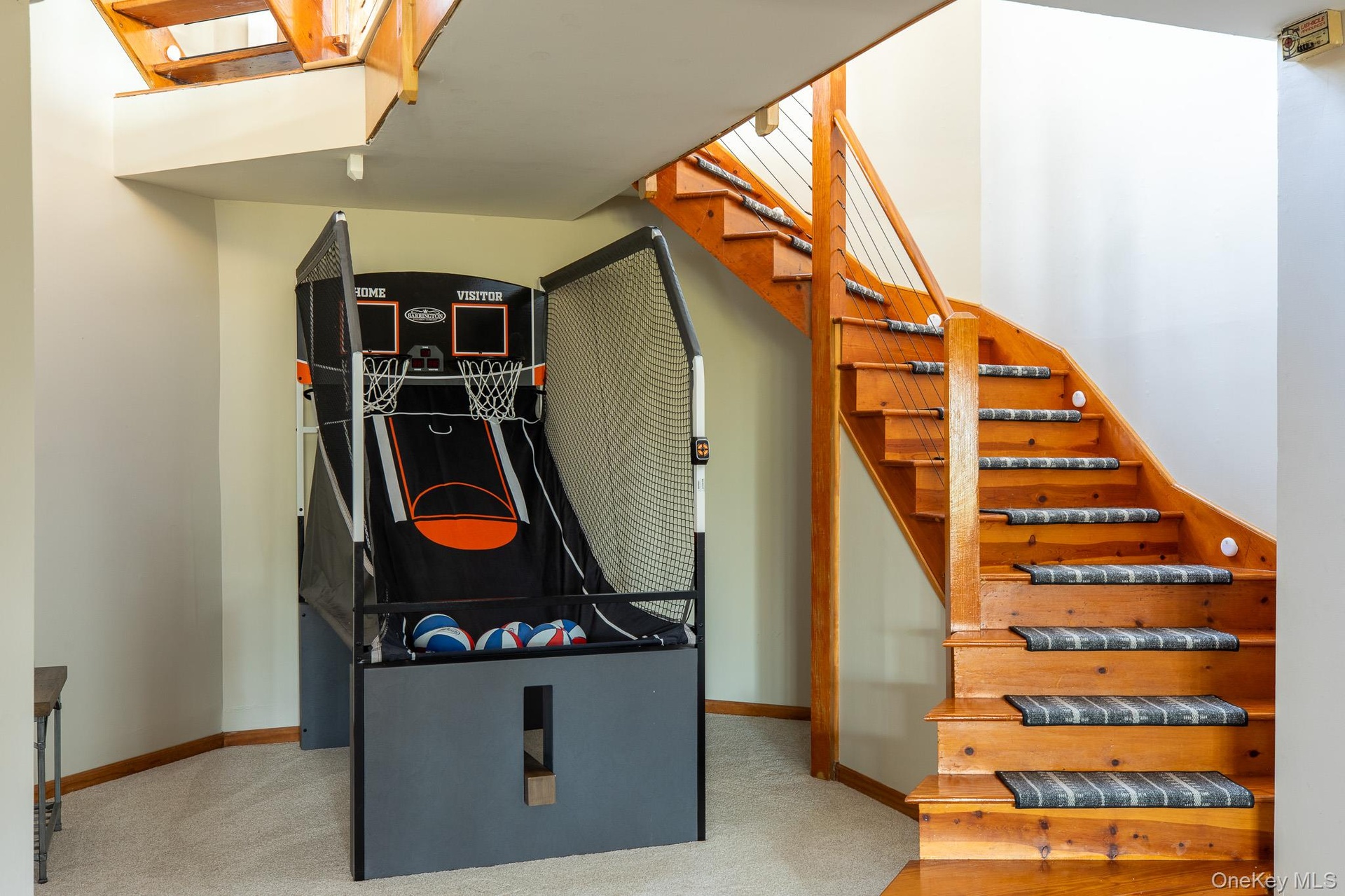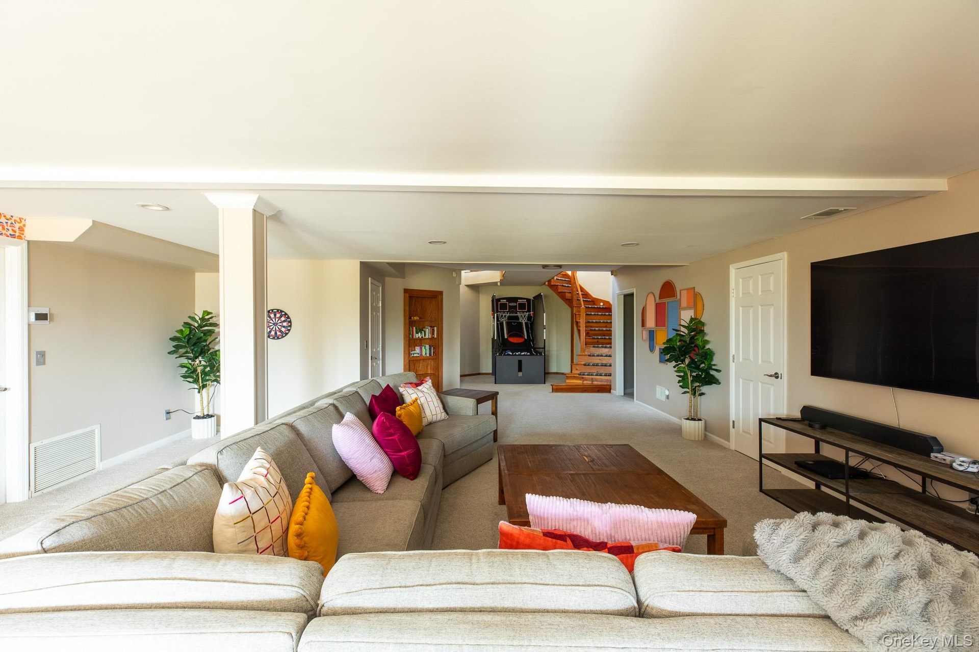 The versatile lower level includes a family room, gym, two bedrooms, a wet bar, and walk-out access to the property's outdoor amenities.