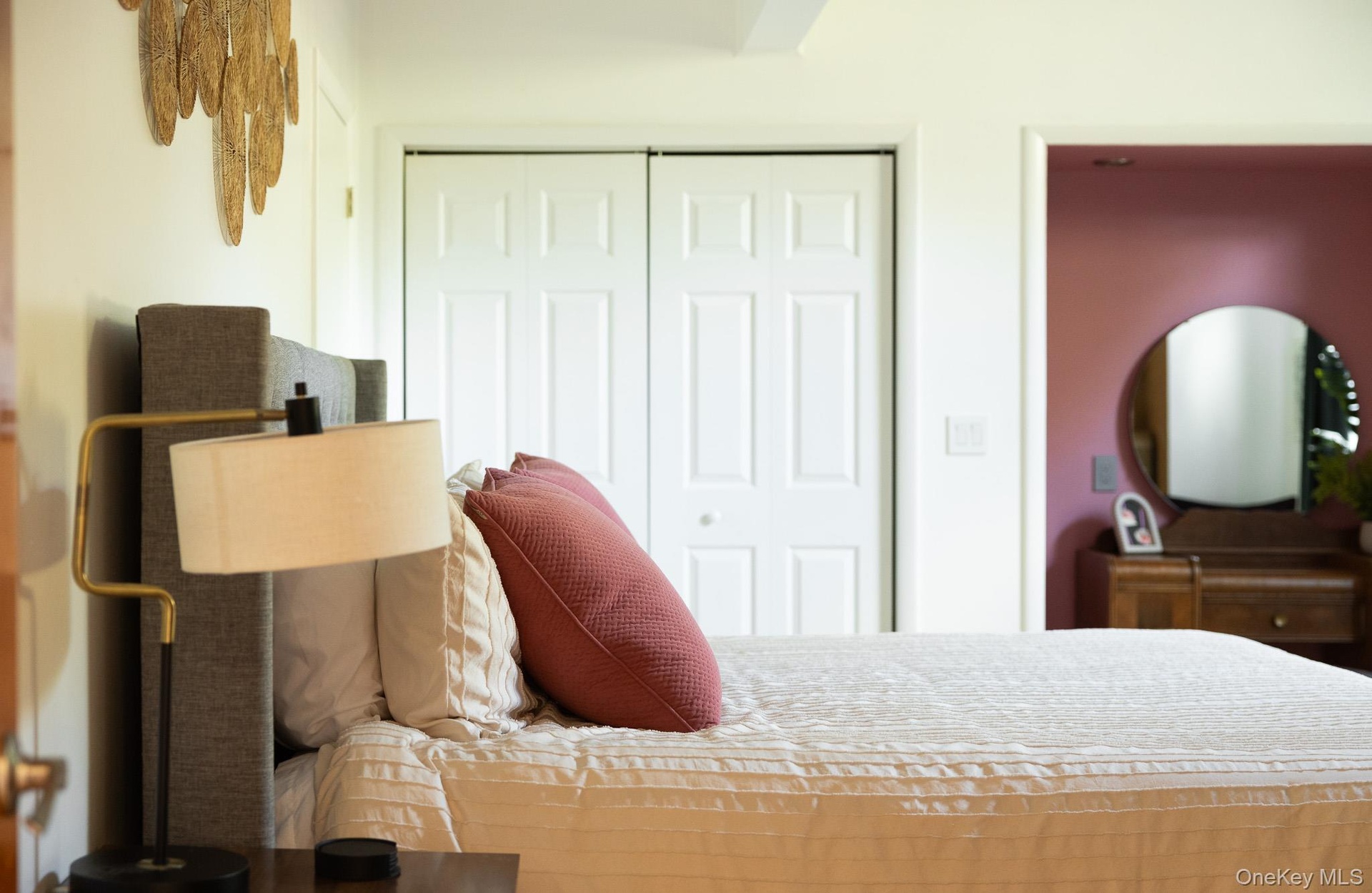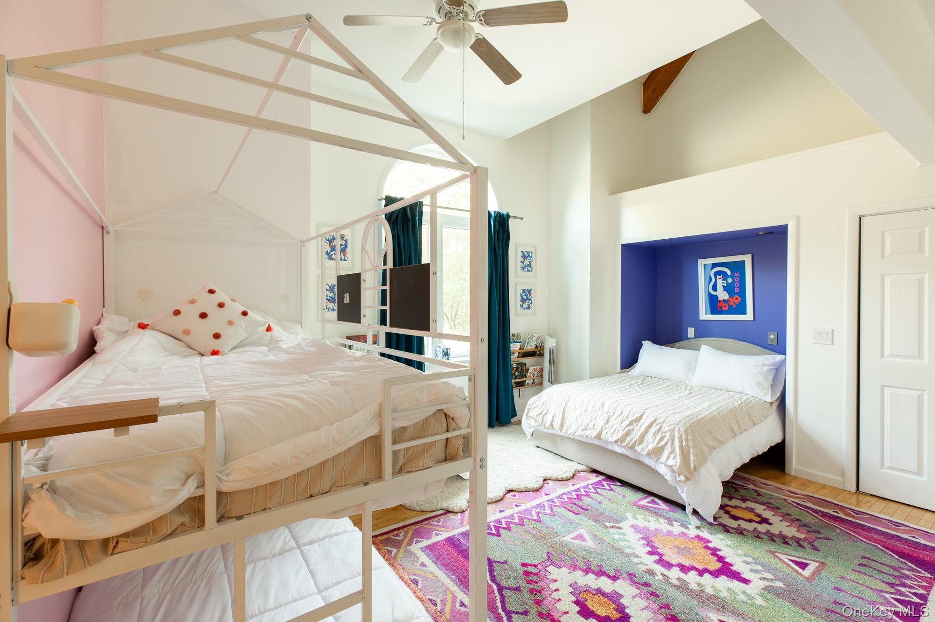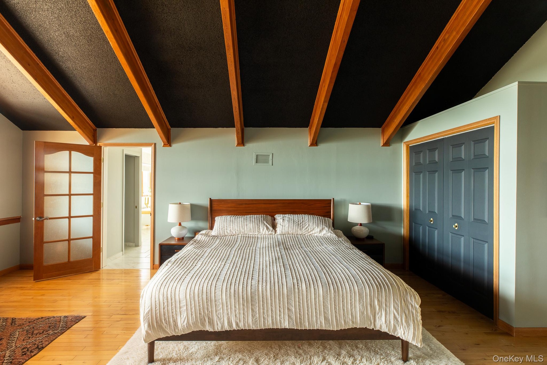 - Bedroom featuring light wood-type flooring, beamed ceiling, and a closet