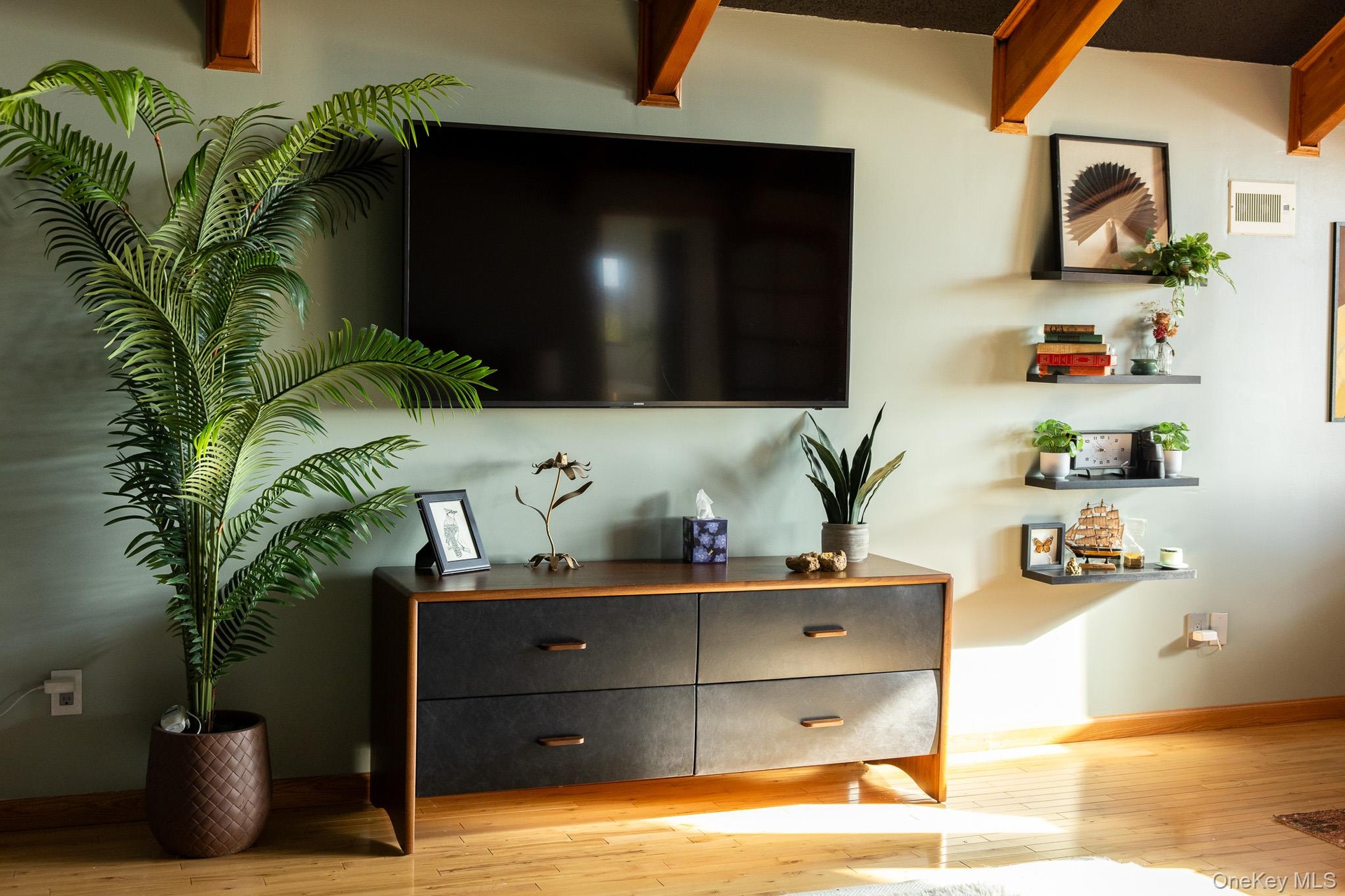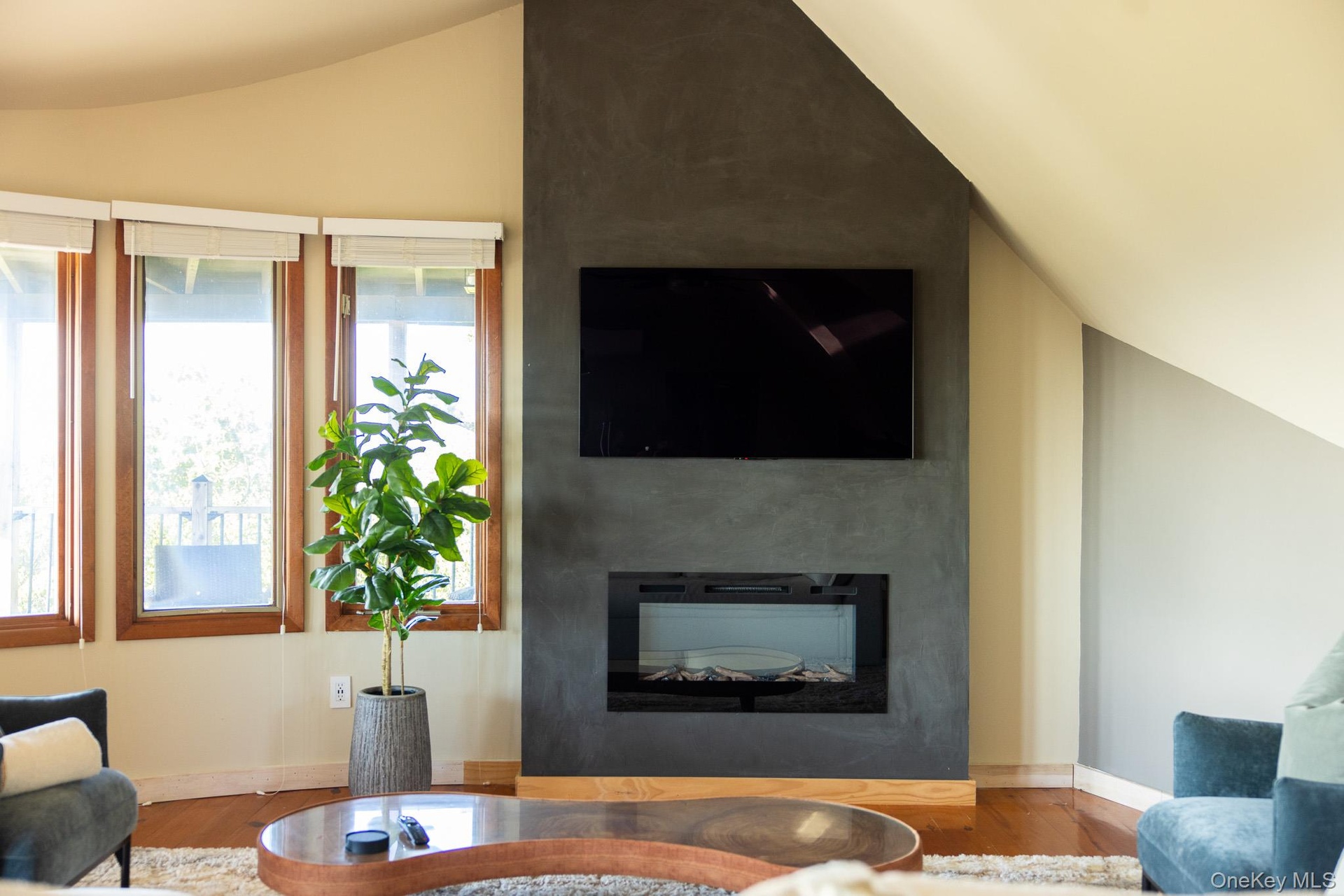 - Living room with vaulted ceiling, a fireplace, and wood finished floors