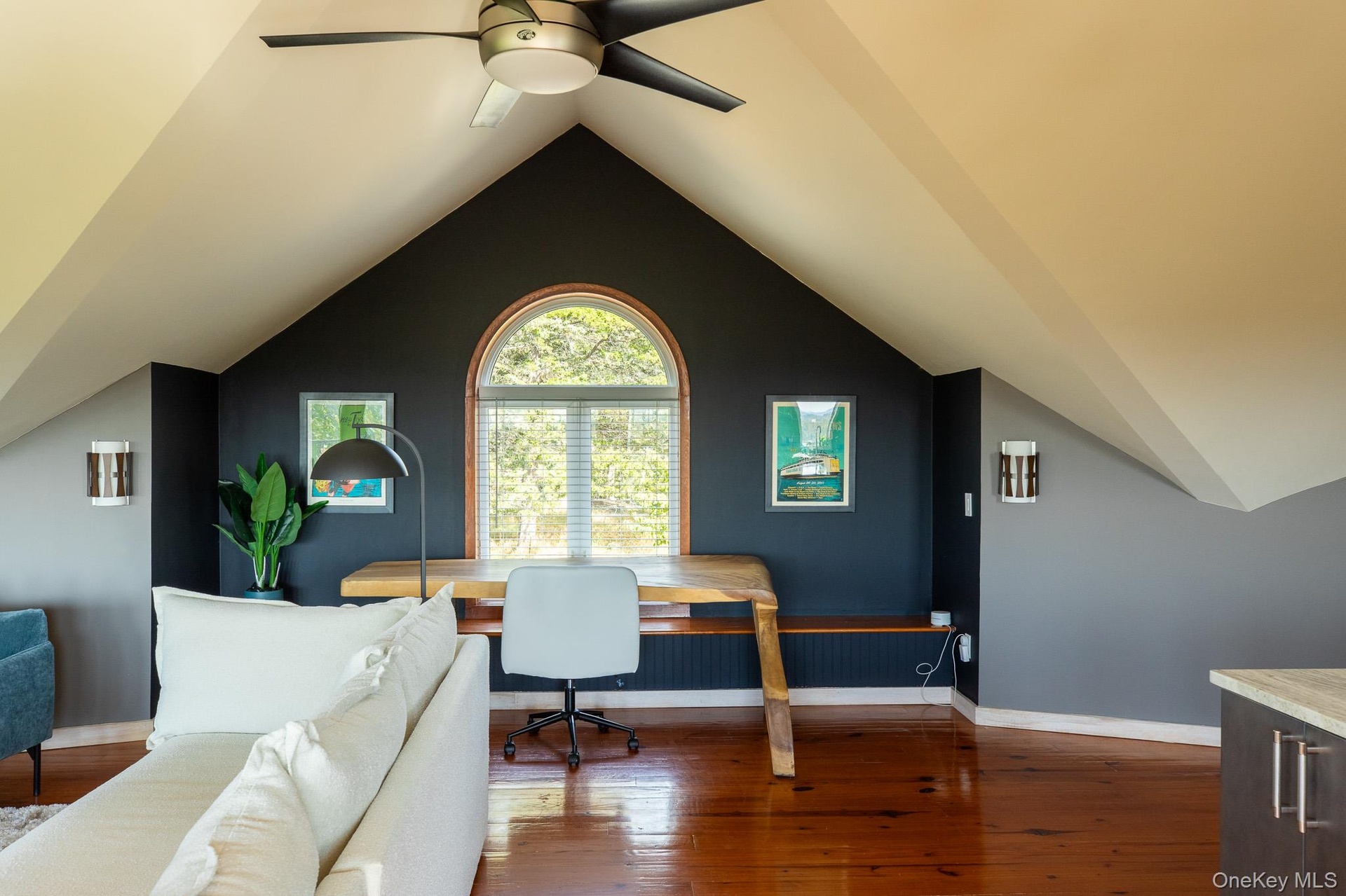 - Office with hardwood / wood-style flooring, vaulted ceiling, and a ceiling fan