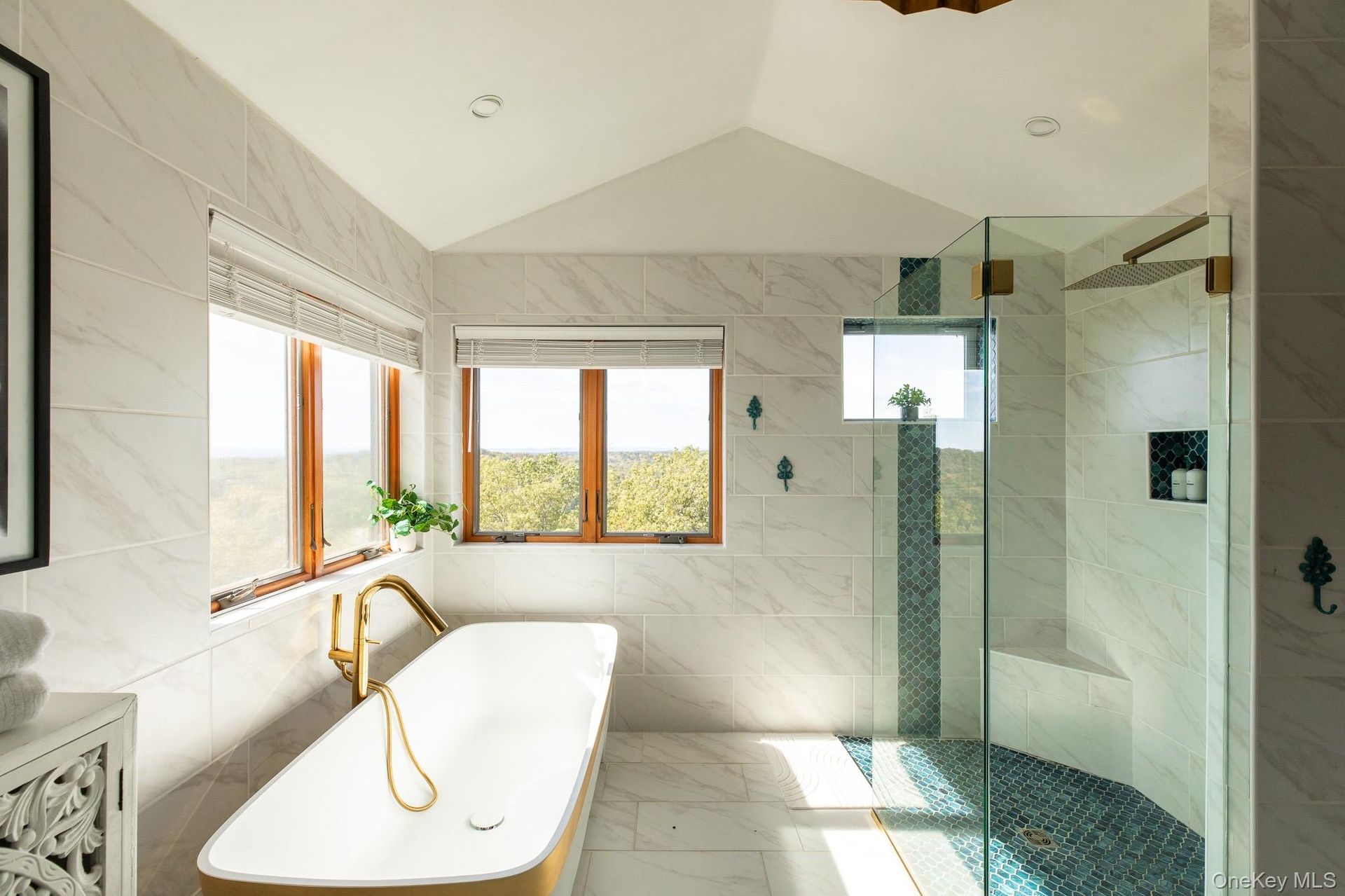 - Full bath with tile walls, lofted ceiling, a walk in shower, a freestanding tub, and marble finish flooring