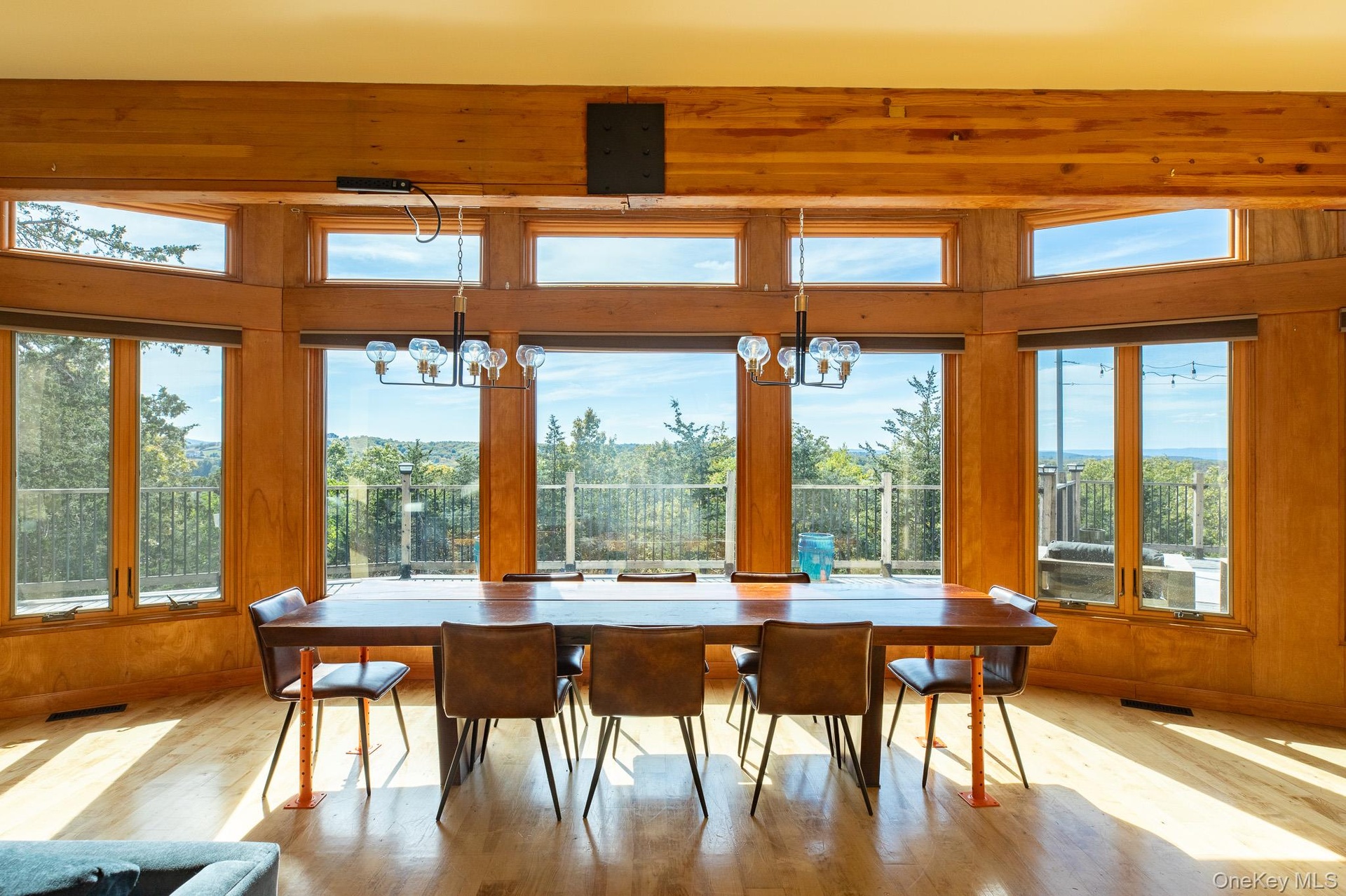 - Dining area with light wood-type flooring, a chandelier, and wood walls