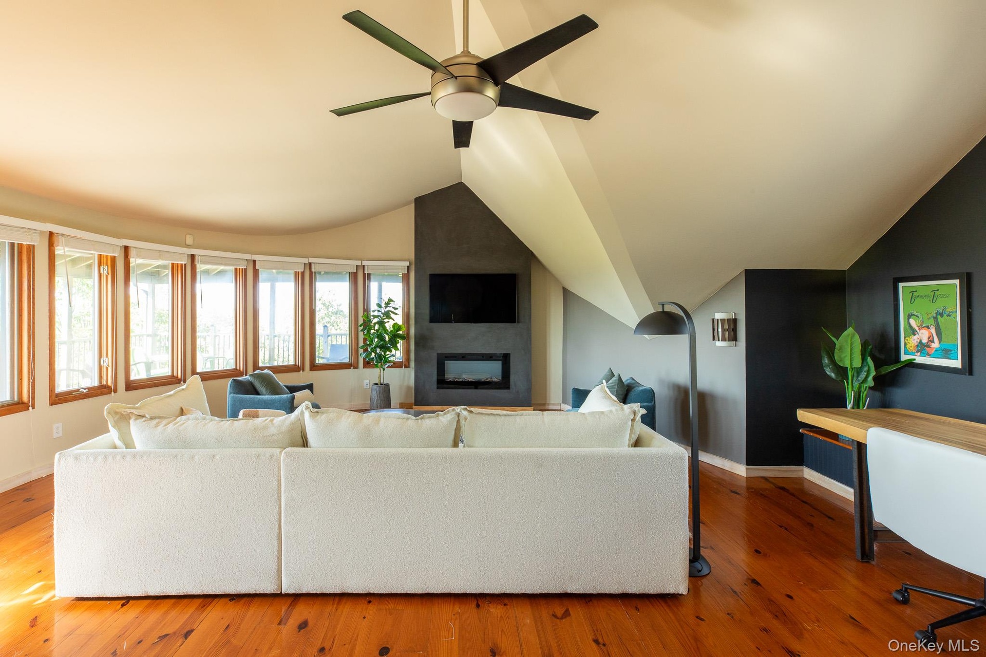 - Living area with lofted ceiling, hardwood / wood-style floors, a large fireplace, and a ceiling fan