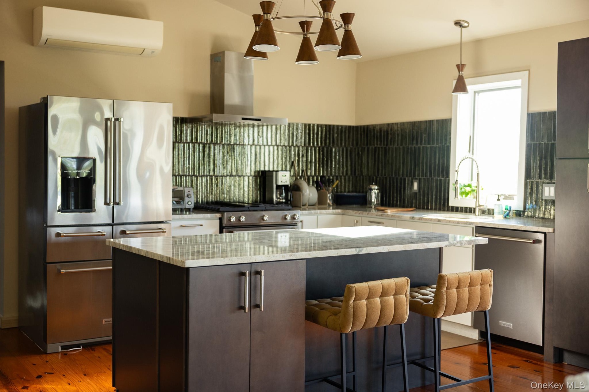 - Kitchen with appliances with stainless steel finishes, decorative backsplash, range hood, and light stone counters