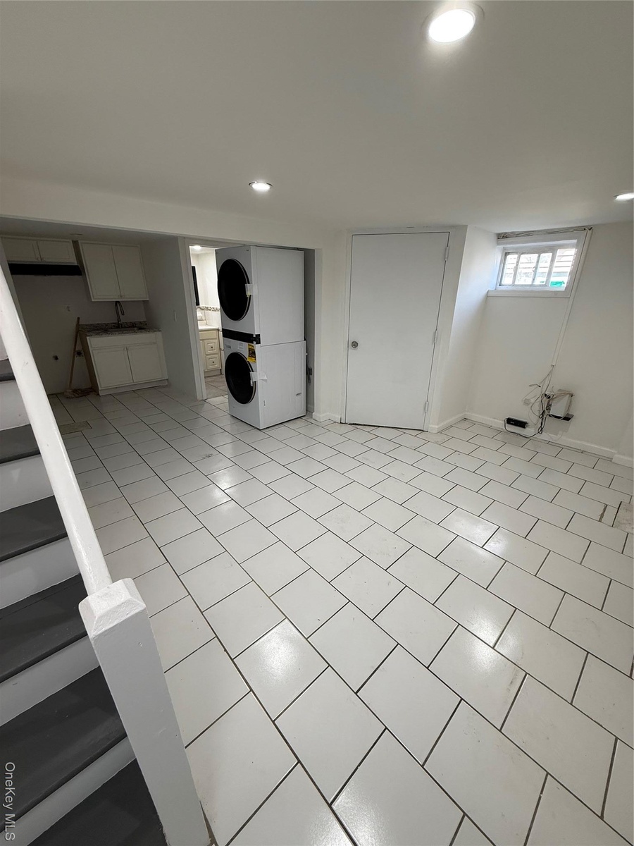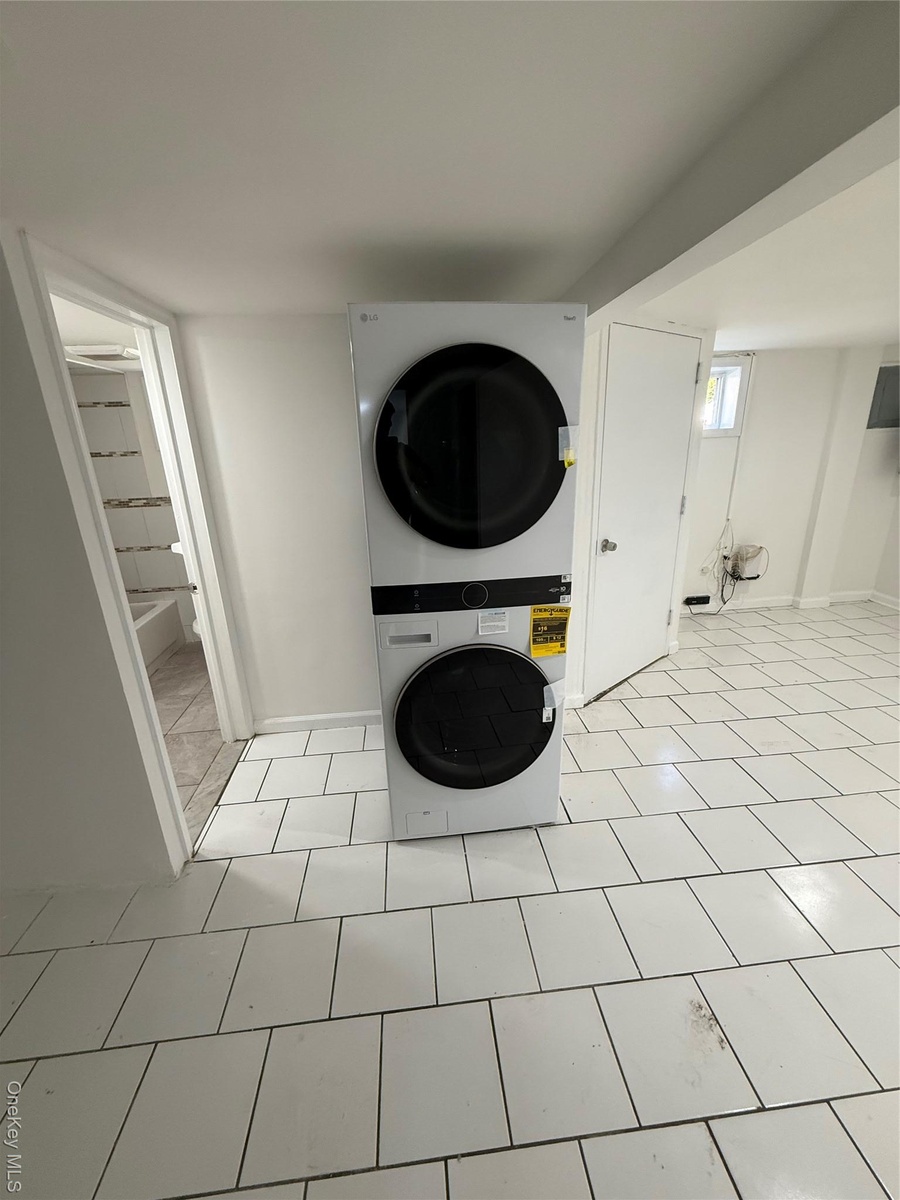 - Laundry room with estacked washer and dryer and light tile patterned flooring