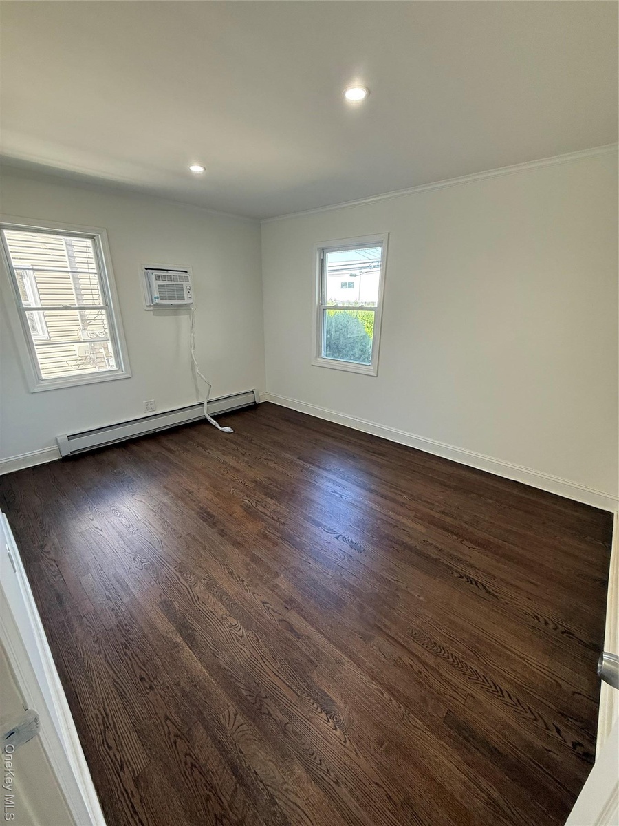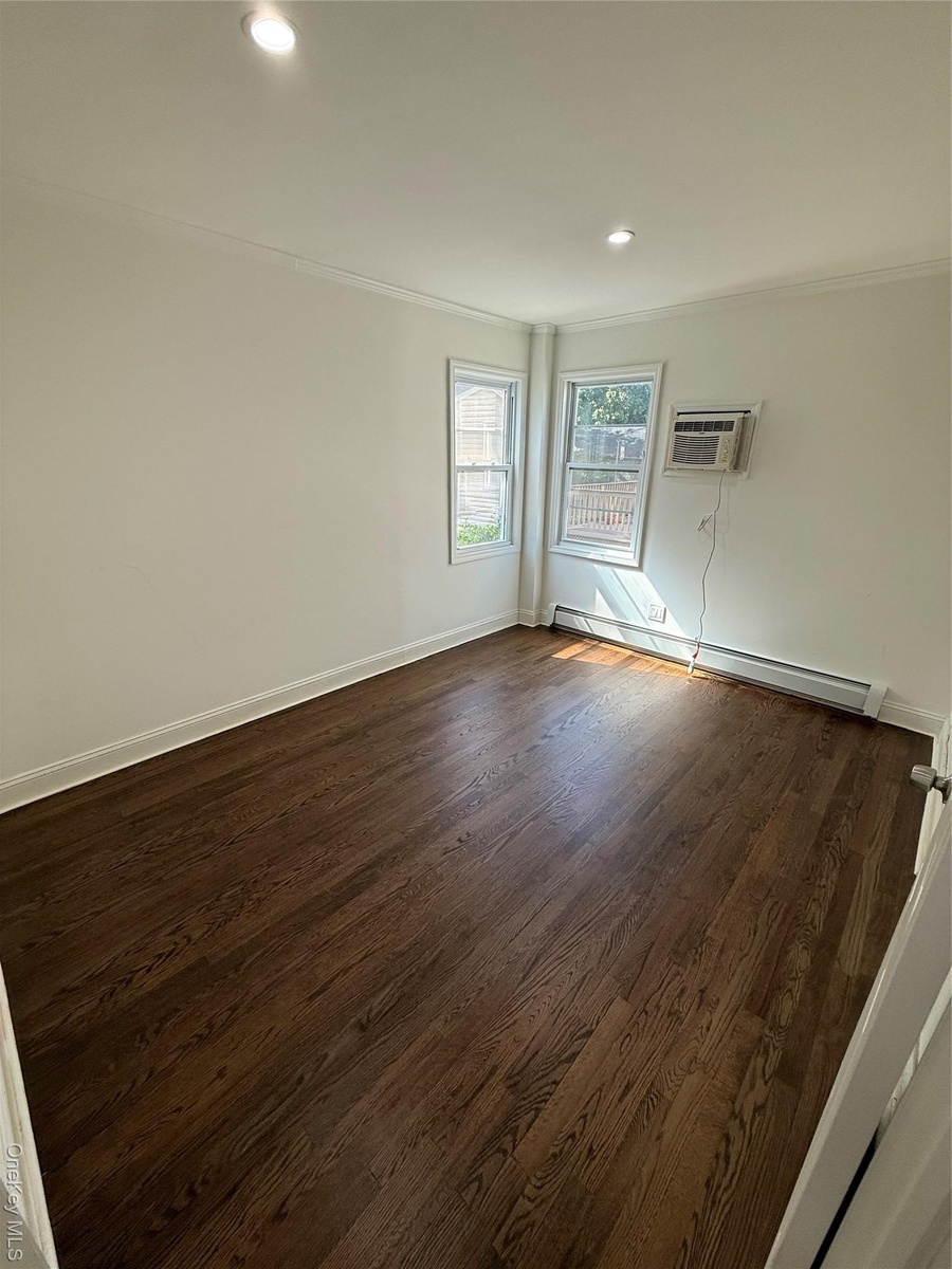 - Unfurnished room with dark wood-style flooring, baseboard heating, crown molding, recessed lighting, and a wall unit AC