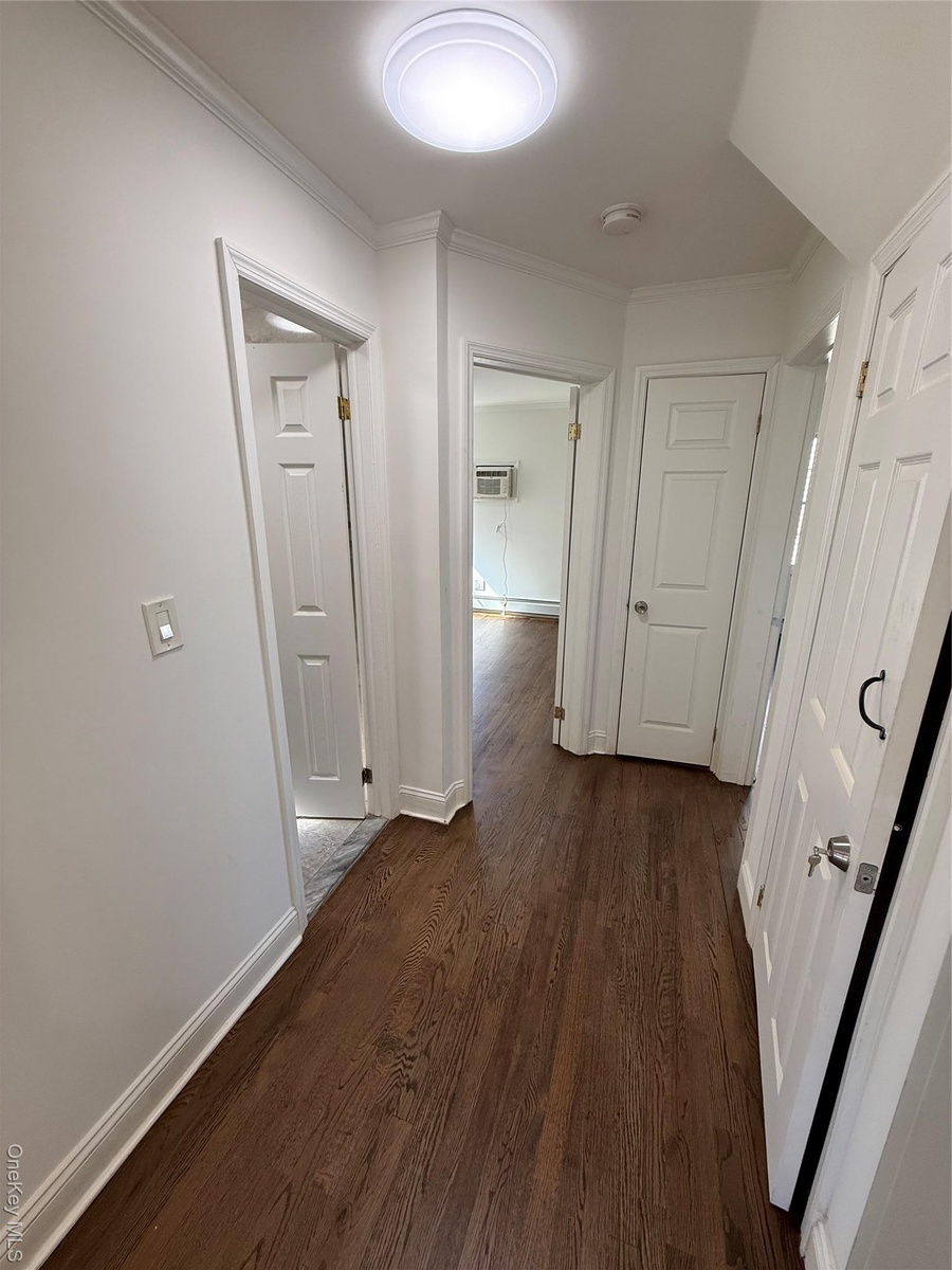 - Hallway featuring crown molding, dark wood finished floors, and a wall mounted AC