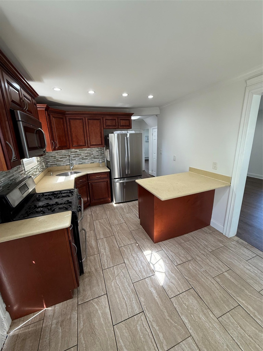 - Kitchen featuring range, a peninsula, freestanding refrigerator, recessed lighting, and backsplash