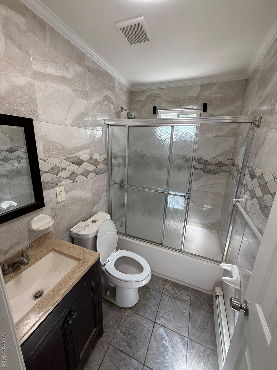 - Bathroom featuring combined bath / shower with glass door, tile walls, vanity, a baseboard heating unit, and crown molding