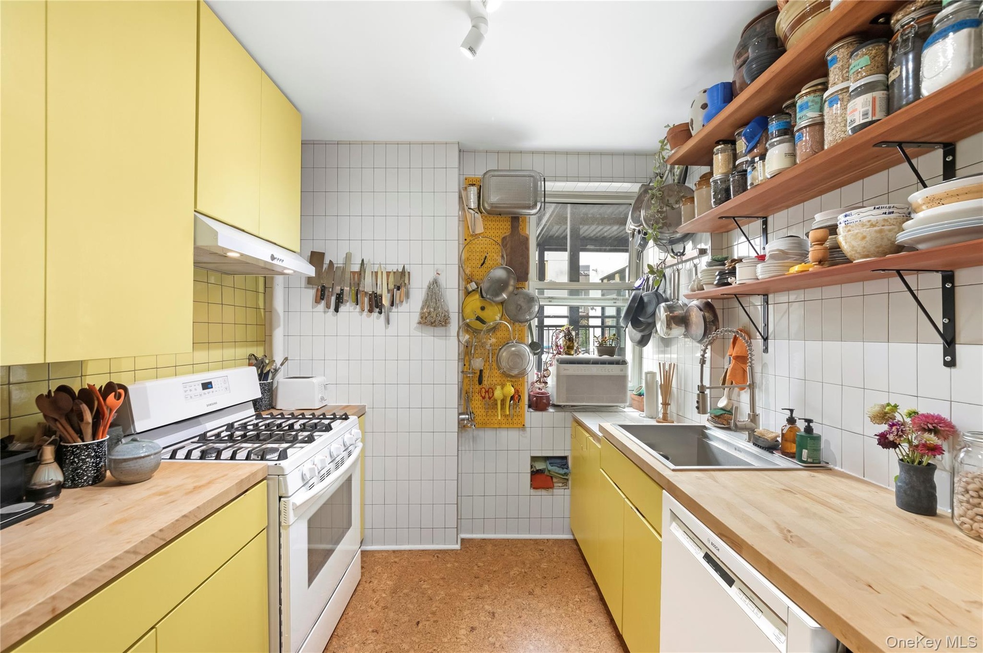 - Kitchen with white appliances, butcher block countertops, under cabinet range hood, open shelves, and tile walls
