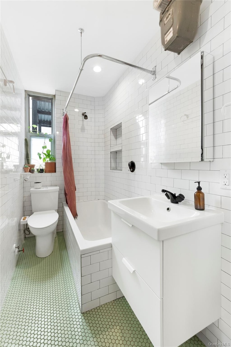 - Full bathroom with tile walls, tiled shower / bath combo, tile patterned floors, and vanity