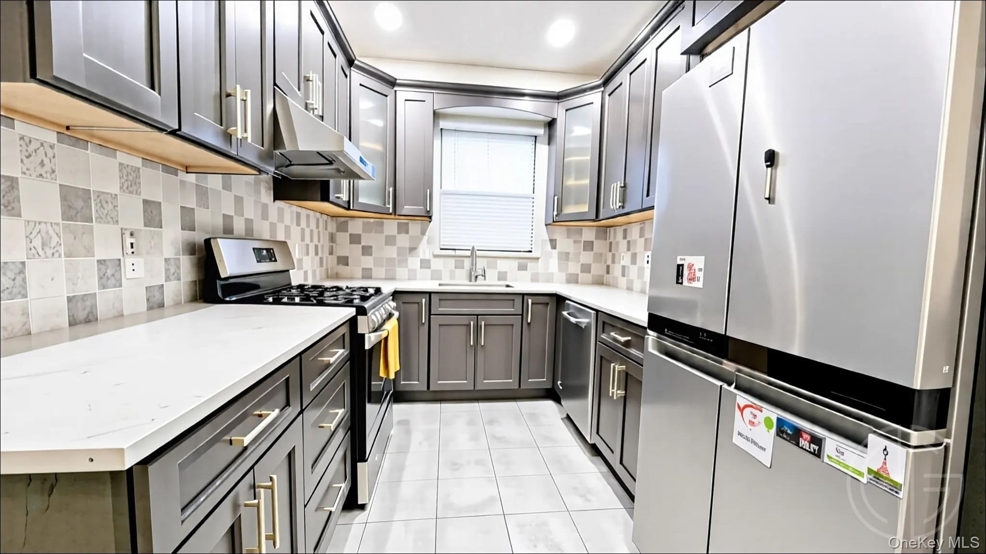 - Kitchen featuring stainless steel appliances, glass insert cabinets, light tile patterned flooring, decorative backsplash, and exhaust hood