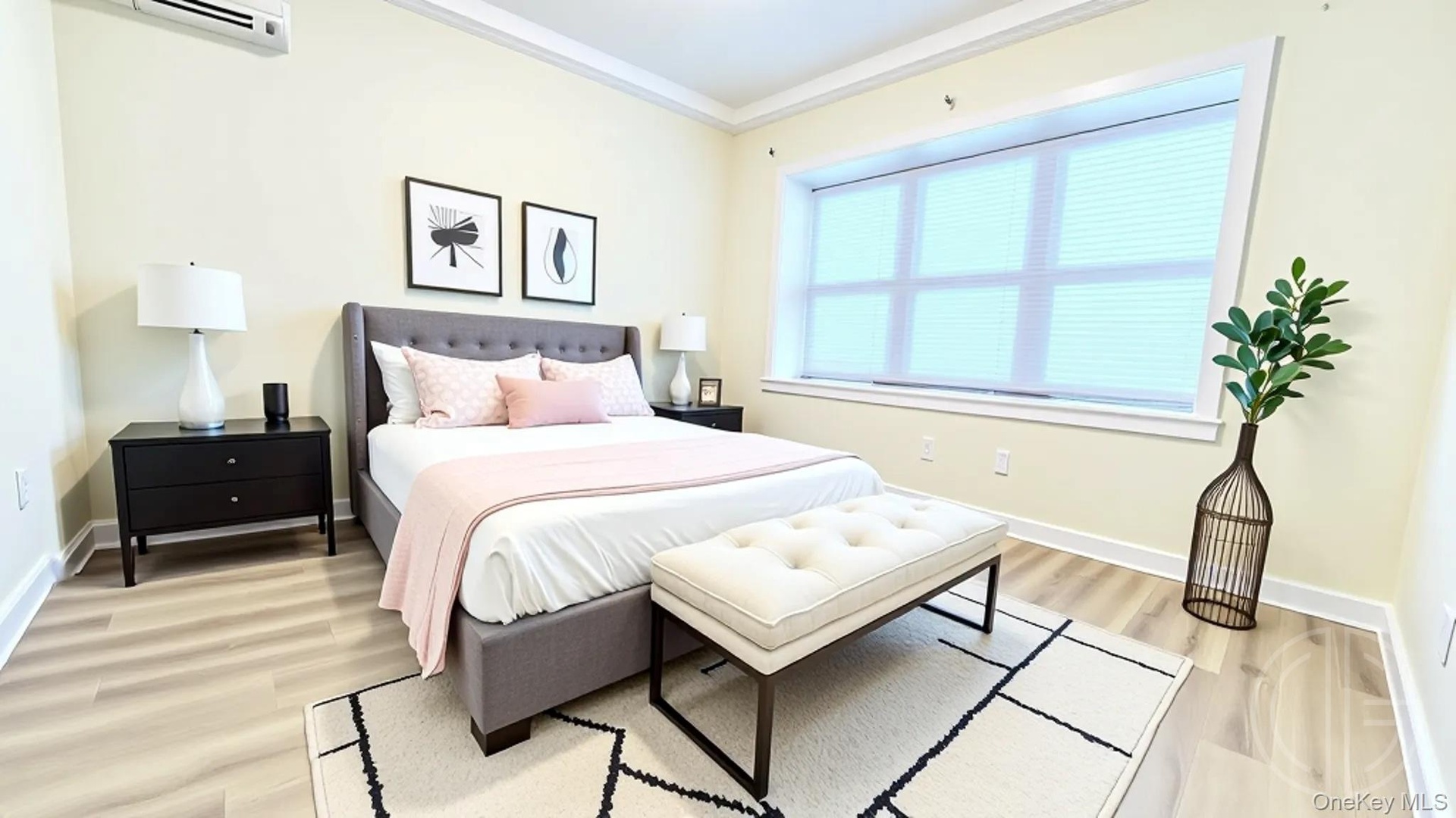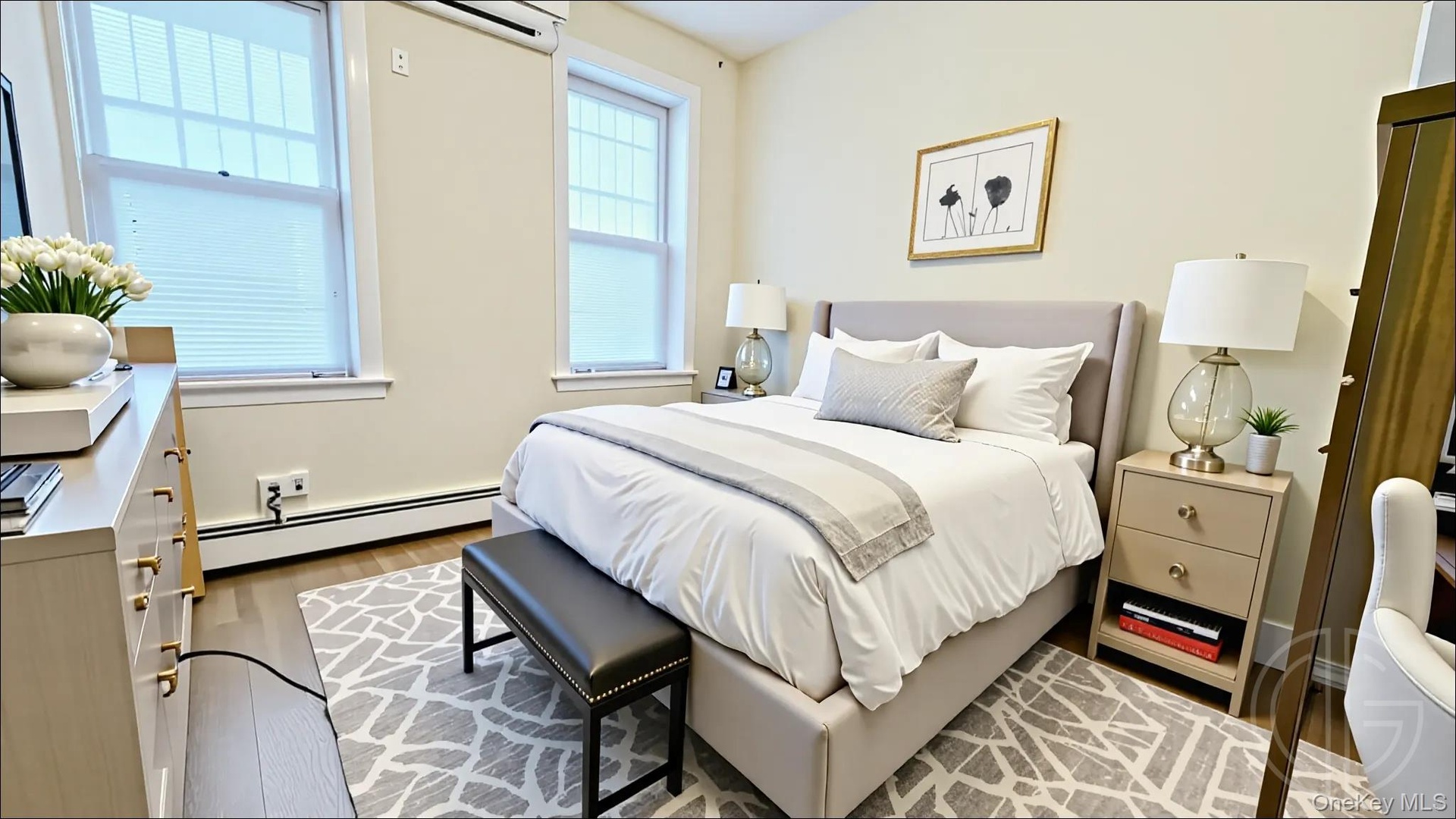 - Bedroom with an AC wall unit, light wood-style floors, and a baseboard radiator