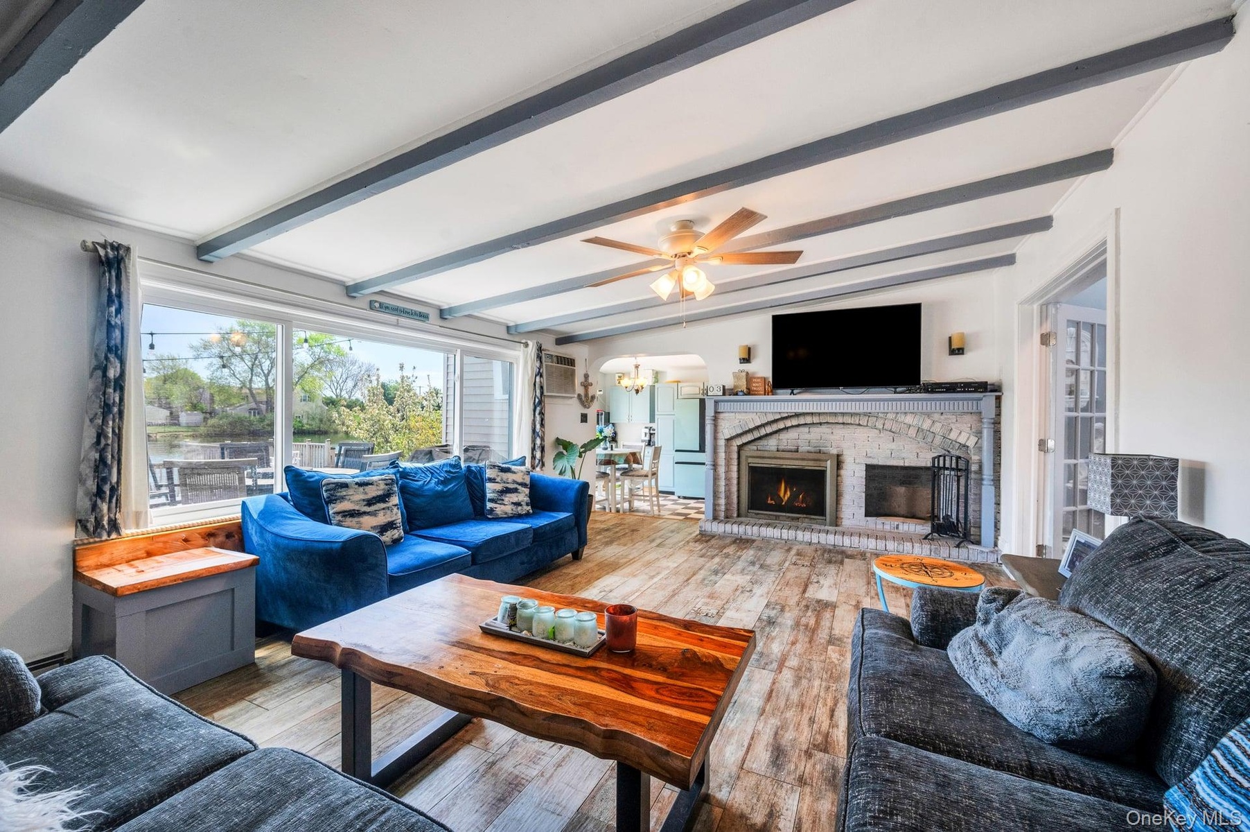 - Living area with light wood-style flooring, beam ceiling, arched walkways, and a fireplace