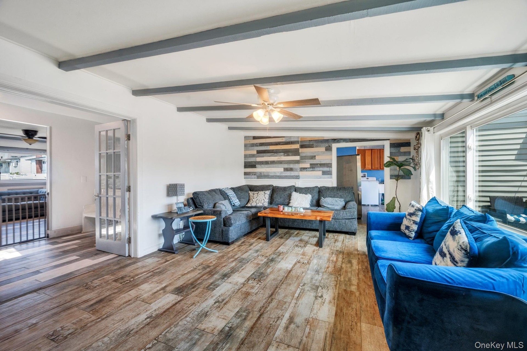 - Living room featuring a ceiling fan, wood finished floors, beamed ceiling, and washer / dryer
