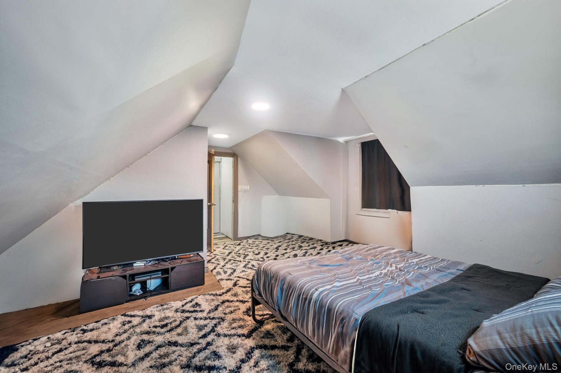 - Bedroom featuring light wood-type flooring, lofted ceiling, and cooling unit