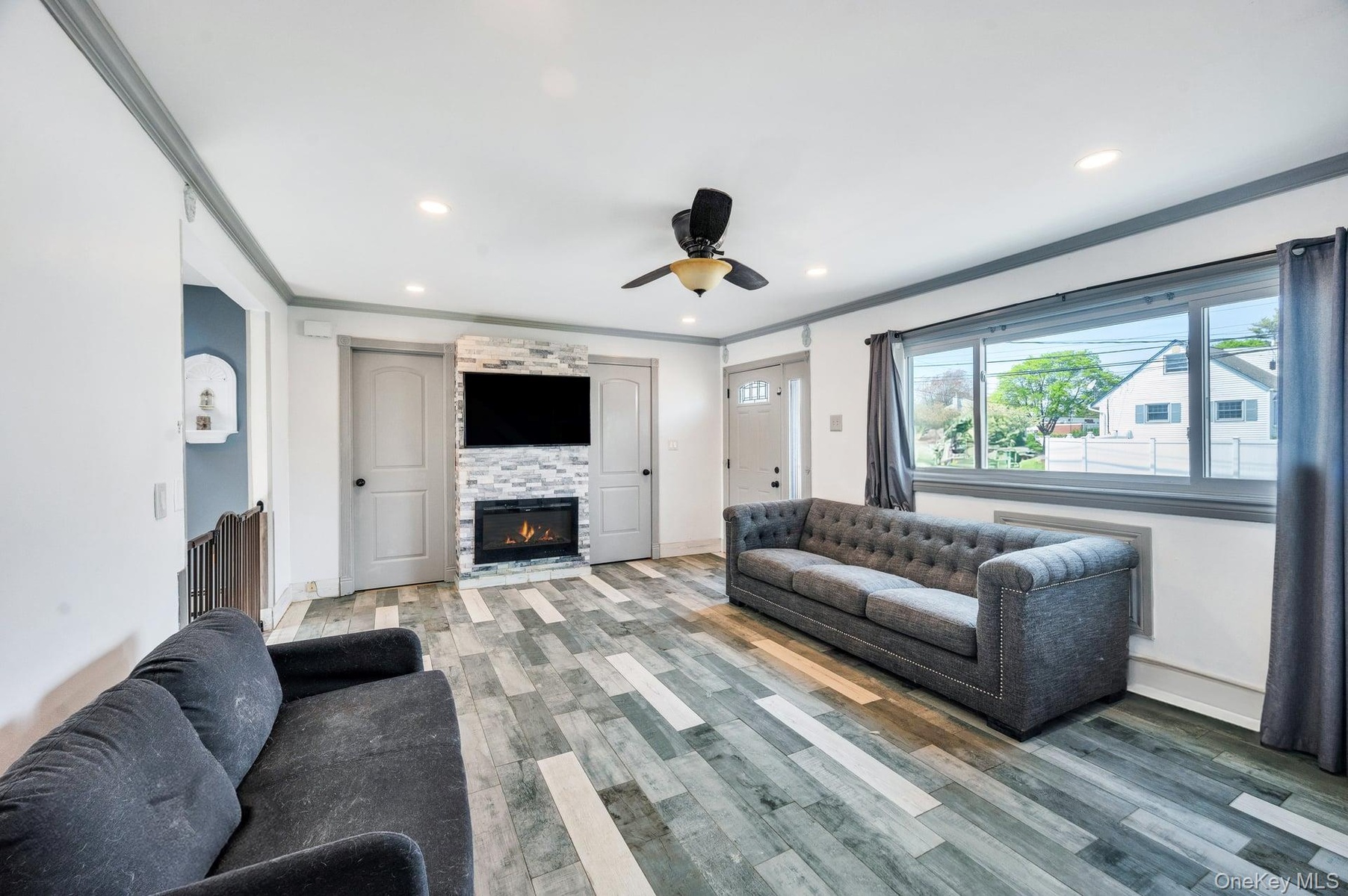 - Living room featuring ornamental molding, wood finished floors, recessed lighting, a ceiling fan, and a large fireplace