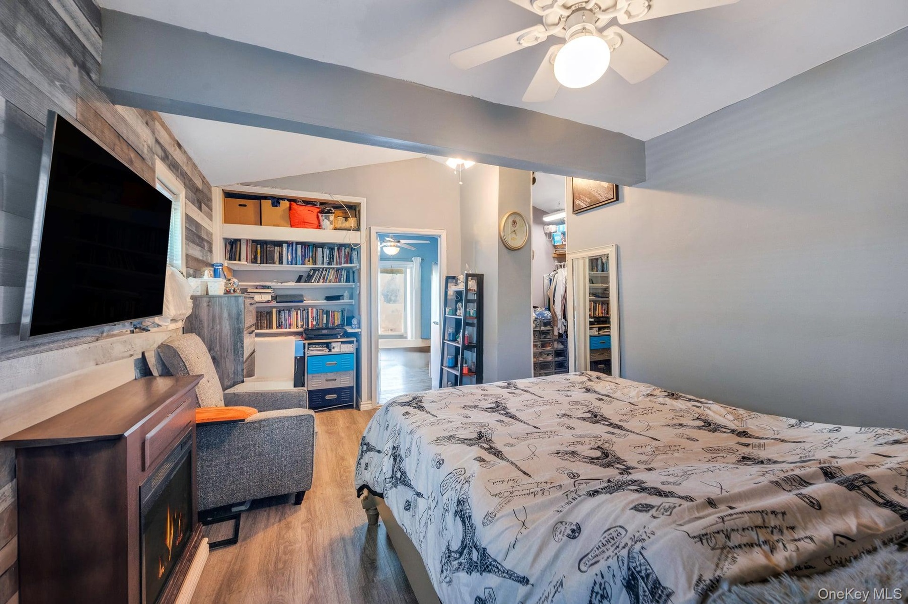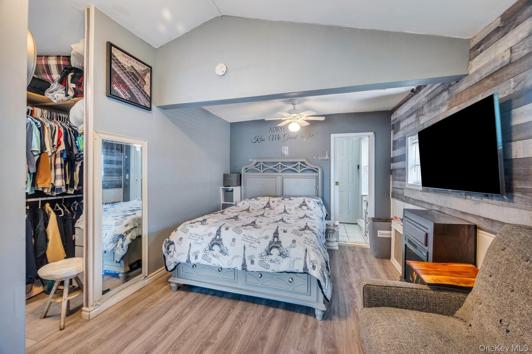 - Bedroom with light wood-type flooring, ceiling fan, and a spacious closet