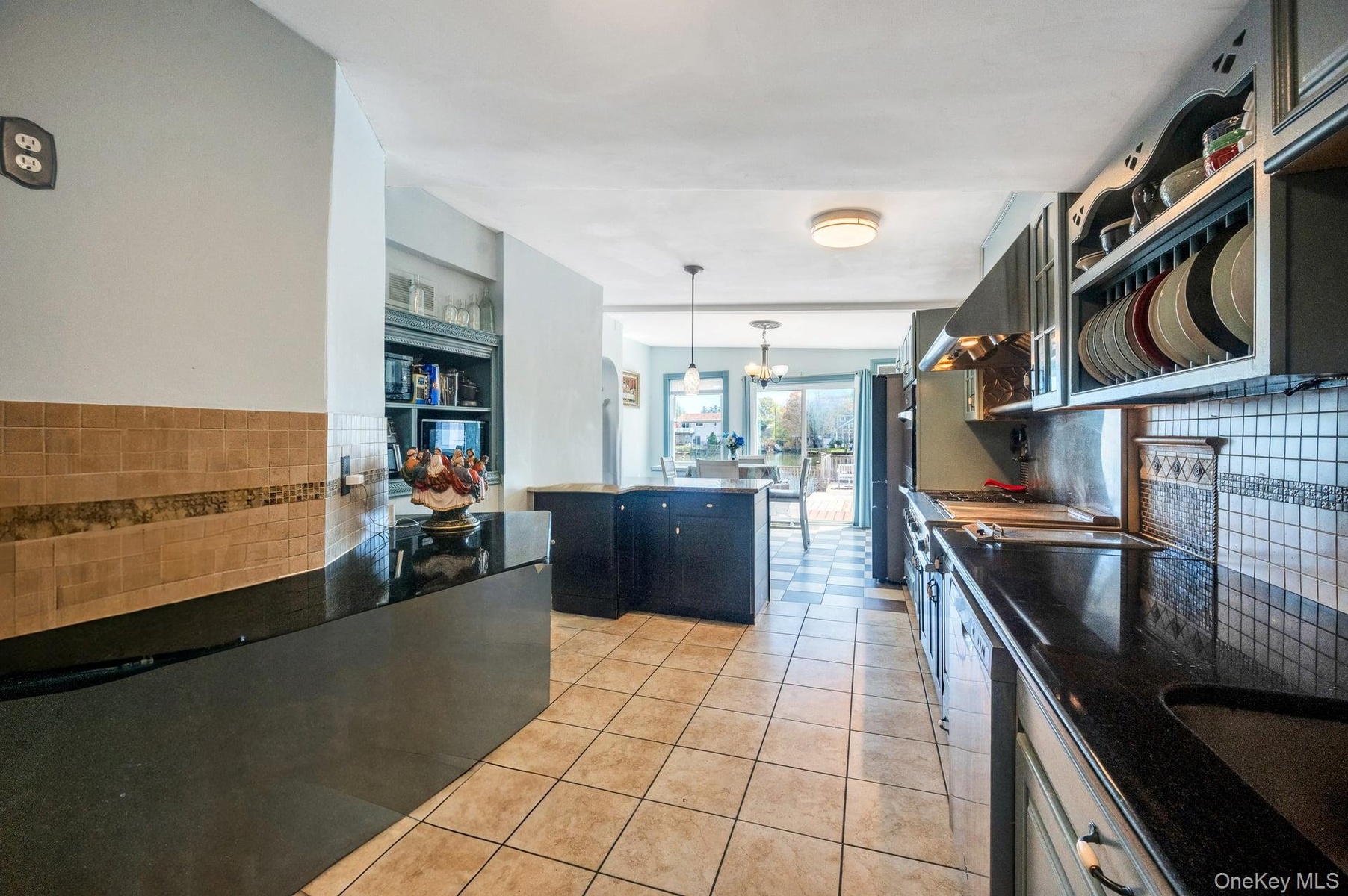- Kitchen with backsplash, dark cabinets, decorative light fixtures, and light tile patterned floors