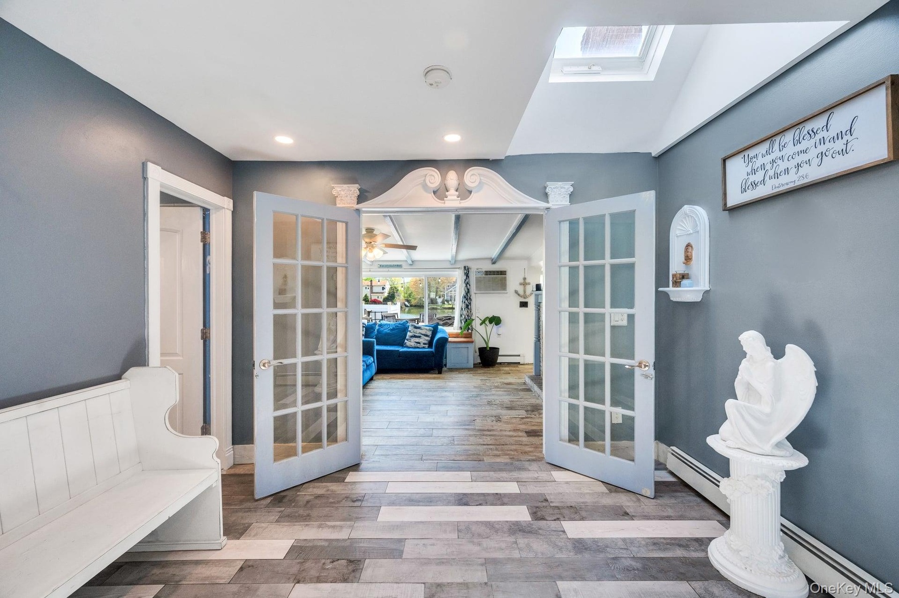 - Doorway to outside with wood finished floors, french doors, a baseboard radiator, recessed lighting, and beamed ceiling