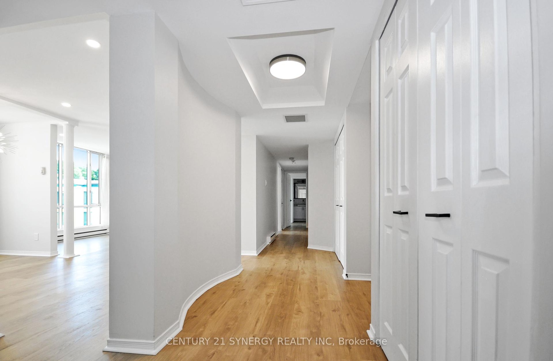 *Some photos have been virtually staged.* Living in renovated comfort on the top floor, this spacious 3-bedroom, 2-bathroom apartment overlooks the serene courtyard. Step inside and you will immediately notice the decorative curved accent wall and updated flooring throughout. The combined living and dining room offers ample natural light from floor-to-ceiling windows. The seller has customized the ceiling with pot lighting and new drywall. You'll love the kitchen featuring two-tone cabinets, quartz countertops, under-cabinet lighting, and stainless steel appliances. The primary bedroom provides plenty of space for a king-sized bed, along with a renovated ensuite bathroom and a walk-in closet. The second bedroom is also generously sized, and the main three-piece bathroom has been renovated. The third bedroom, located at the far end of the hallway, is ideal for a guest room or home office. Added conveniences include full-sized in-unit laundry and additional storage. Ground-level parking further enhances comfort. Residents can enjoy beautiful facilities such as a courtyard terrace and a common room. The location offers easy access to the Shenkman Arts Centre, Place D'Orleans Mall, restaurants, grocery stores, medical offices, the future LRT, walking paths, and much more. 24 hours irrevocable on all offers.