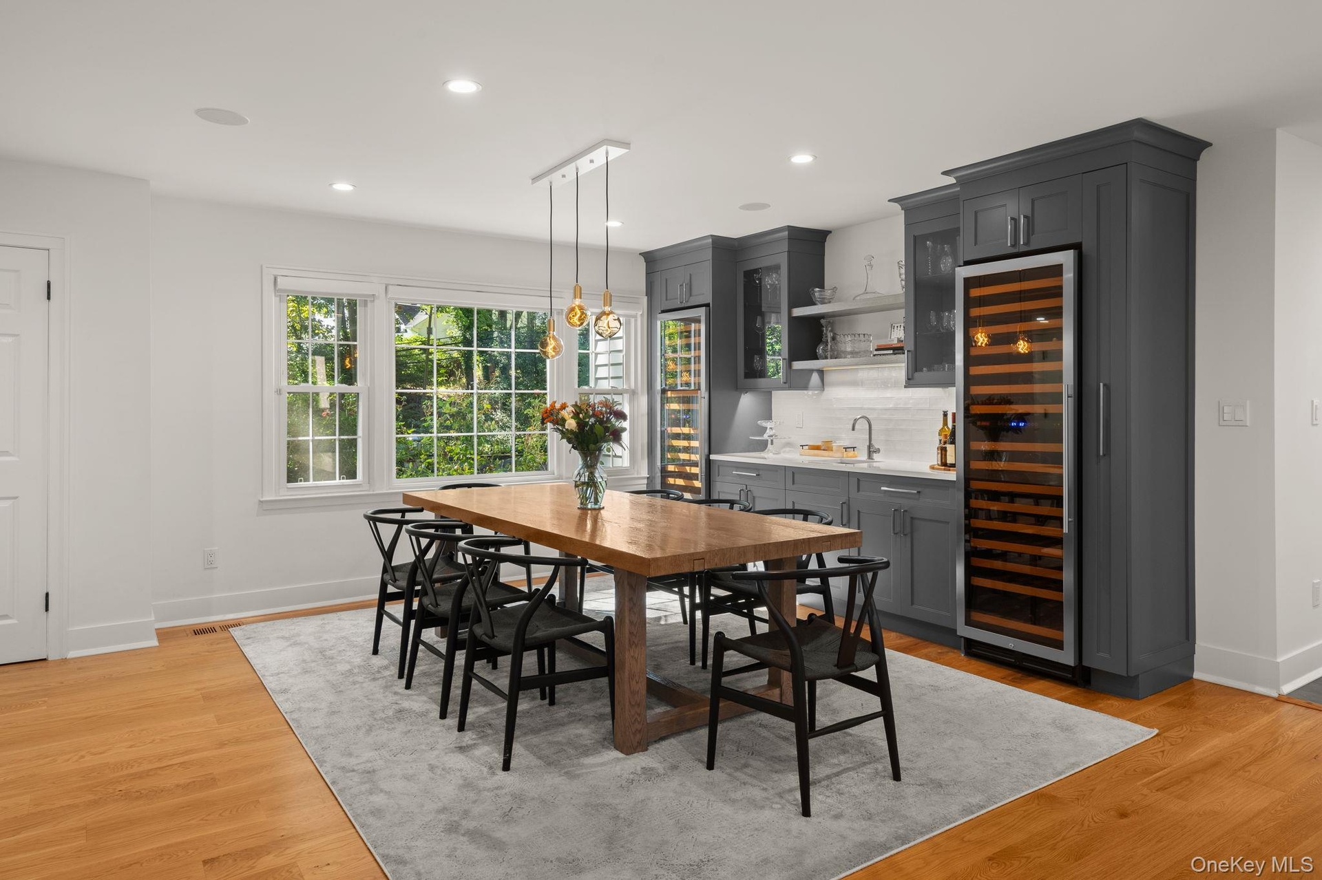 The adjacent dining area is perfect for hosting, complete with a wet bar and dual full-size wine refrigerators. Enjoy open-concept living spaces with gleaming hardwood floors throughout, and relax in the great room with a cozy wood-burning fireplace and picturesque views of the patio and backyard.