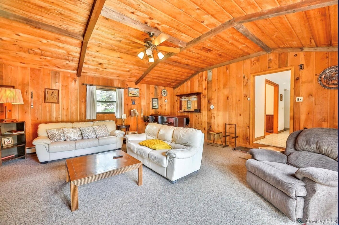 - Carpeted living room with wooden walls, wood ceiling, and a ceiling fan