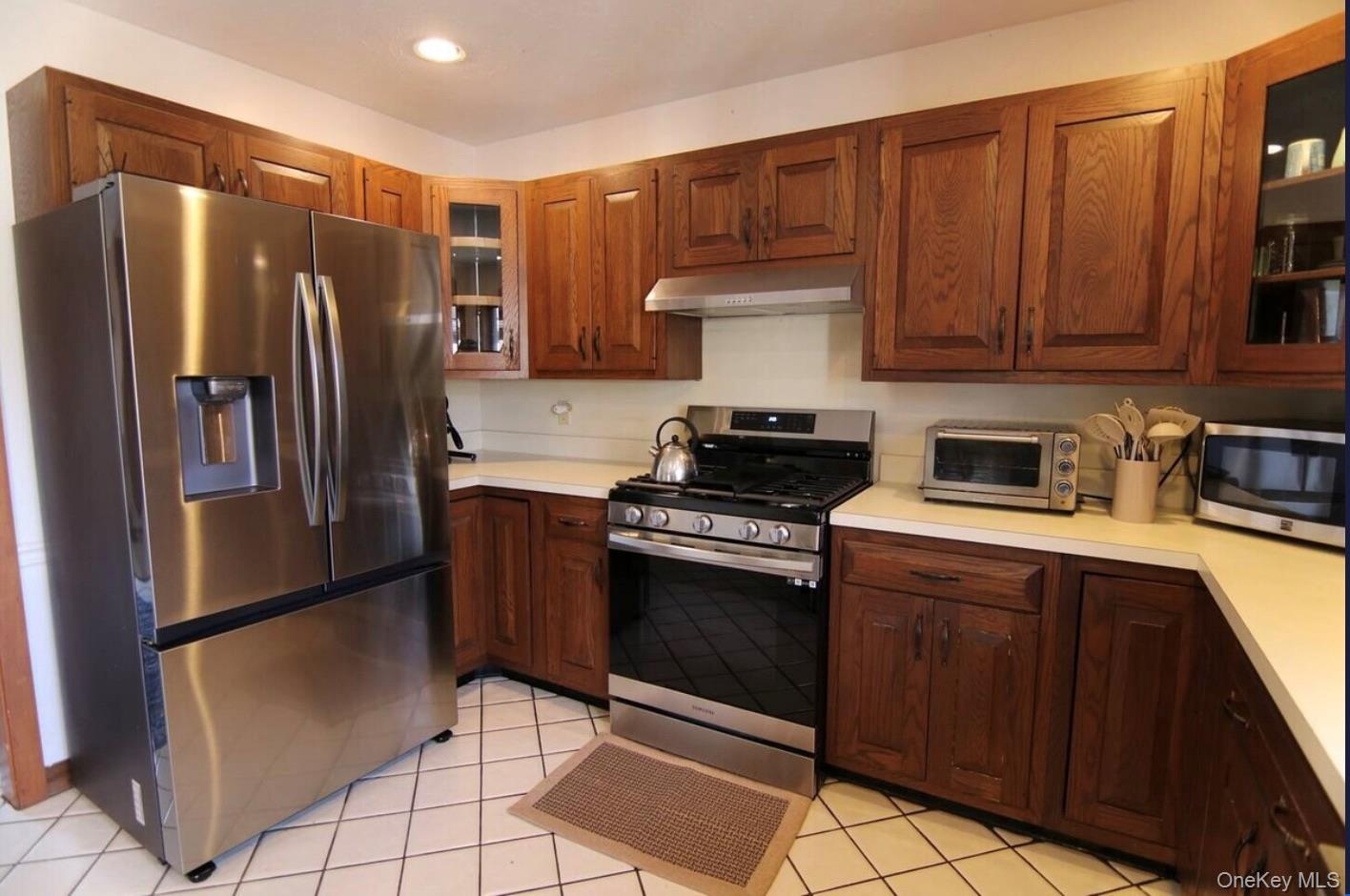 - Kitchen featuring stainless steel appliances, brown cabinetry, light countertops, light tile patterned floors, and recessed lighting
