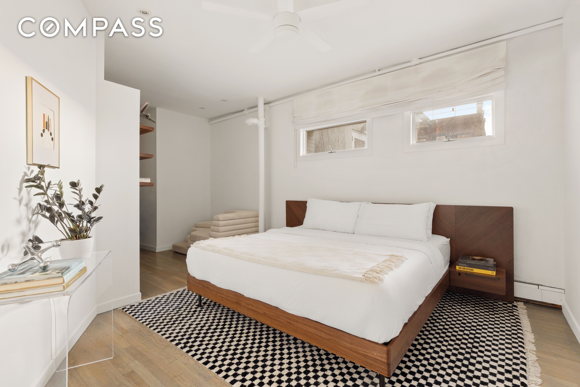 The almost 400 SF primary bedroom is tucked away at the other end of the home and spans an impressive 22 feet wide. This sun-soaked room with a wall of three oversized, north-facing windows, features exposed brick and plenty of space for a king-sized bed, two nightstands, and additional furniture. The second bedroom is pin-drop quiet and fits a king sized bed, plus furniture, and includes a dressing area with a built out closet.