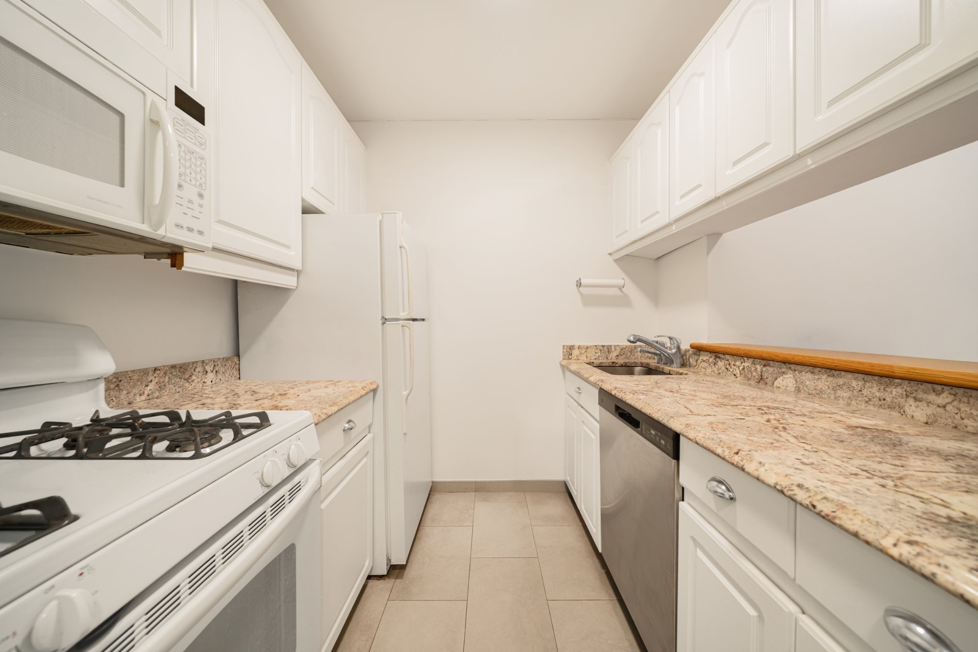 -Classic white kitchen appliances with stainless steel dishwasher & microwave. Abundant cabinetry and counter space