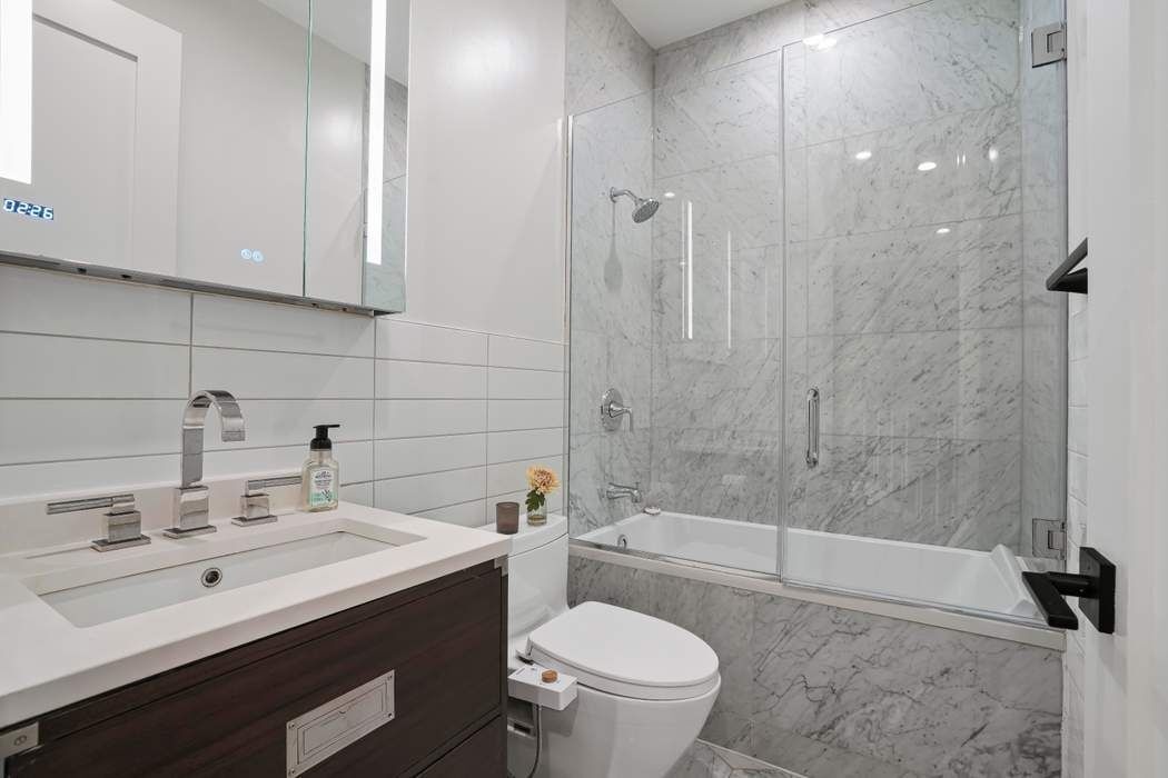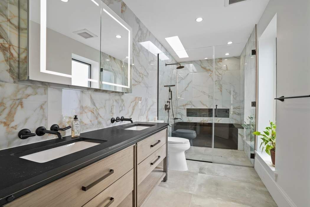 An elegant staircase leads you to the second floor where you will find 3 generous bedrooms, 2 spa-like bathrooms, and a laundry area for added convenience. The luxurious primary suite has a wall of south facing windows, double closets, and a sunny en suite bathroom complete with skylight, double vanity, rainfall shower, and deep soaking tub. The additional 2 bedrooms are bright and airy with great closet space and large windows. A beautiful hall bathroom with marble accents and a separate laundry area occupy the center of the floor.