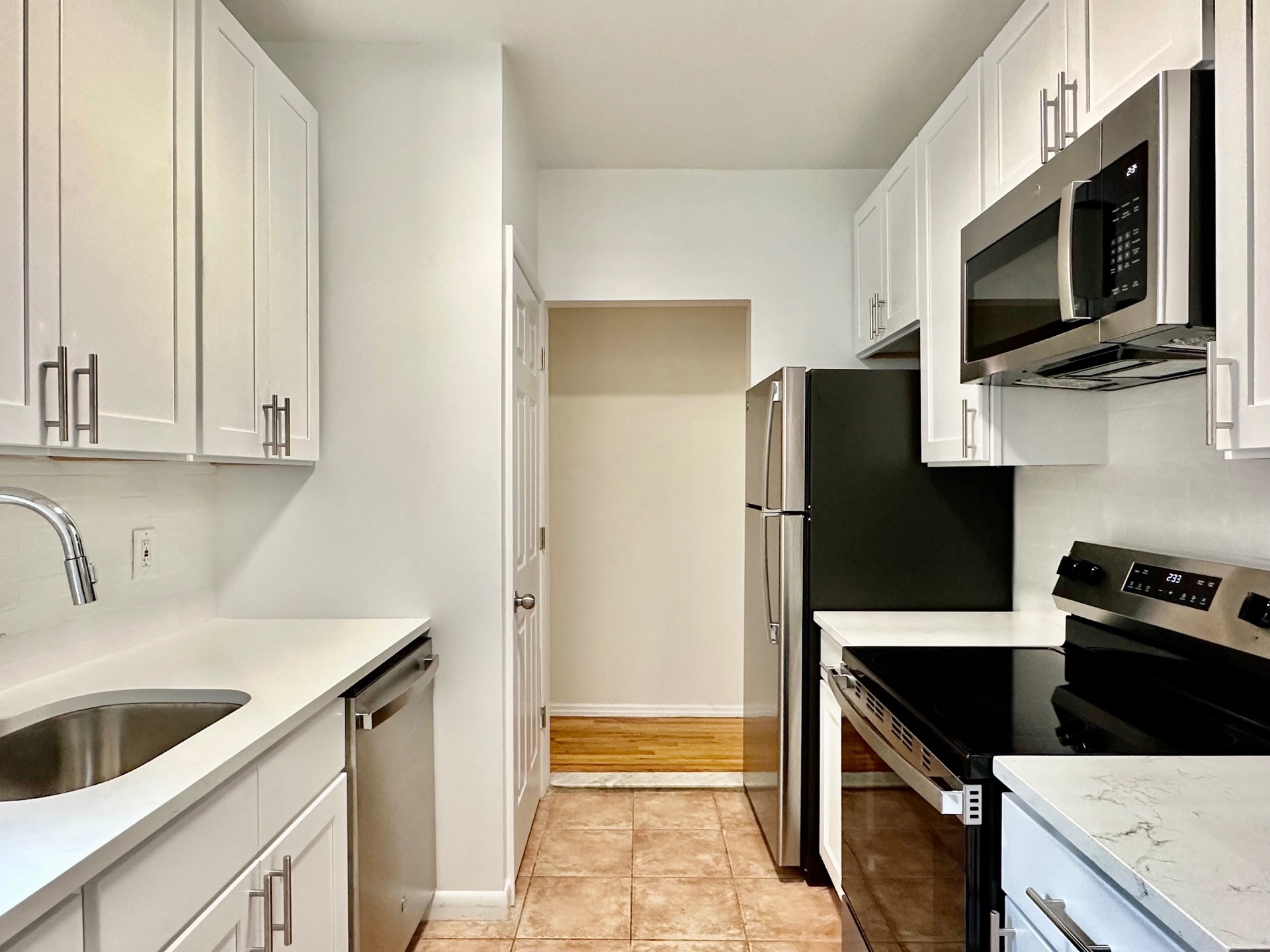 Windowed brand-new kitchen with new white Shaker cabinets, granite countertop and new stainless steel appliances.