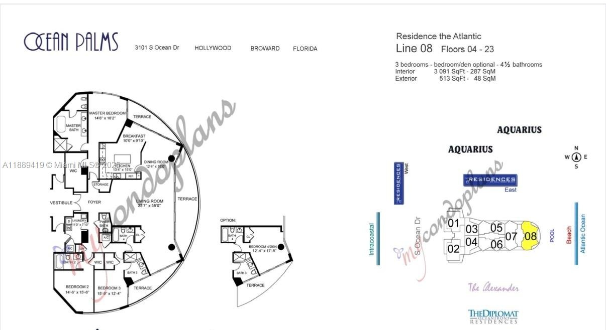 DescriptionCompletely remodeled direct oceanfront residence at Ocean Palms. 3 bedrooms plus den (convertible to office/4th bedroom), 4.5 baths, 3,091 sq. ft. interior + 513 sq. ft. balconies. Beautiful Italian slab tile floors throughout, custom bathrooms with European fixtures, master bath with double vanity, tub, glass shower, and walk-in closets in all bedrooms. Leicht German kitchen with custom cabinetry, quartz counters, Miele appliances incl. induction cooktop and retractable downdraft vent. Two new AC units. Three balconies with ocean, city & Intracoastal views. Amenities: resort-style pool, 2-story fitness center, spa, party & billiard rooms, movie theater, tennis court, BBQ area, 24/7 security, valet. Apartment includes 2 garage spaces & storage.Virtual Tour: https://www.propertypanorama.com/instaview/mia/A11889419Amenities- Balcony