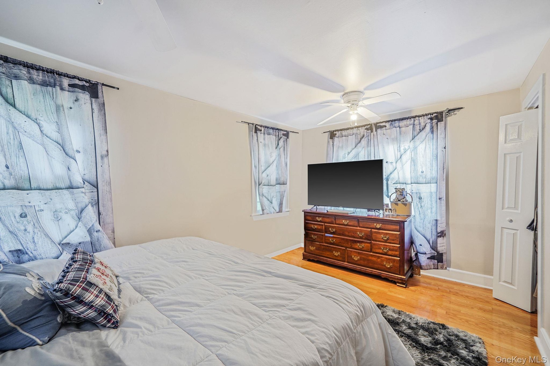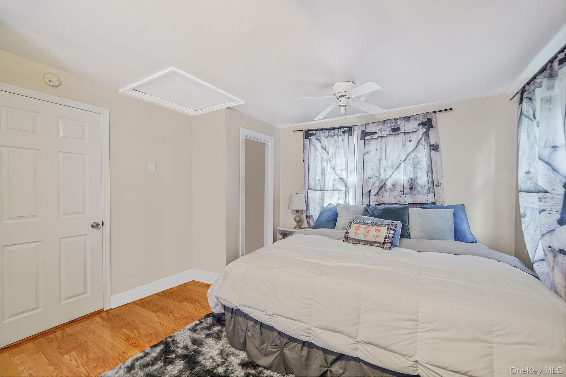 - Bedroom featuring light wood-type flooring, attic access, and ceiling fan