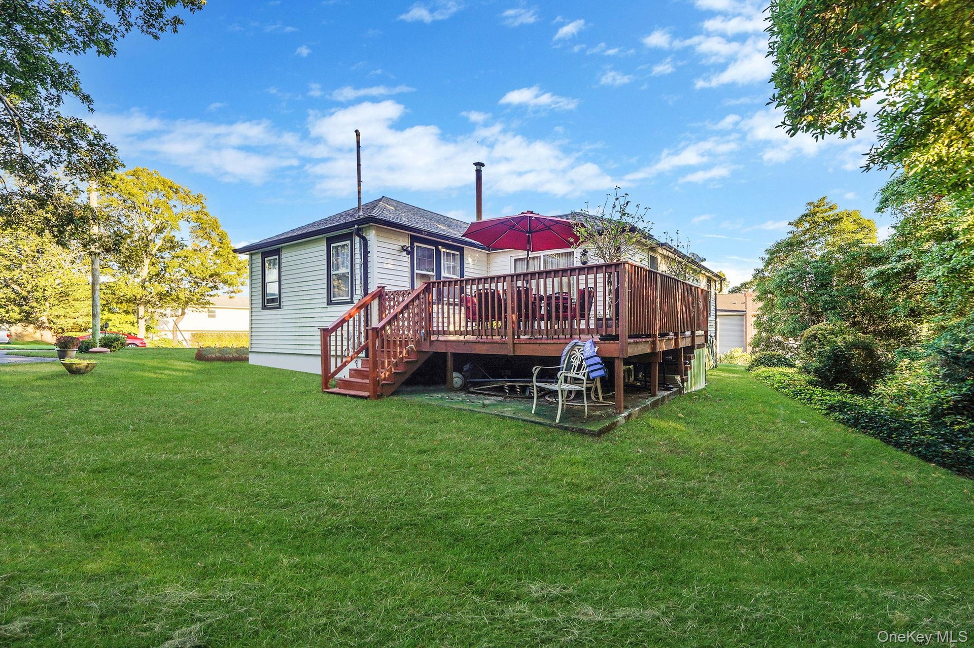 - Rear view of house with a lawn, a wooden deck, and stairs