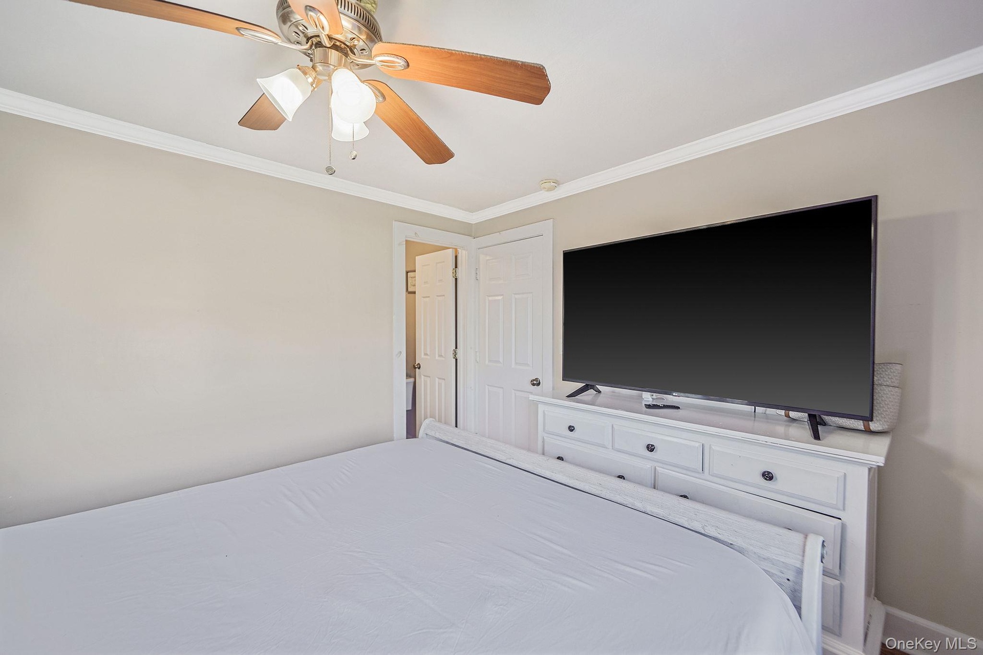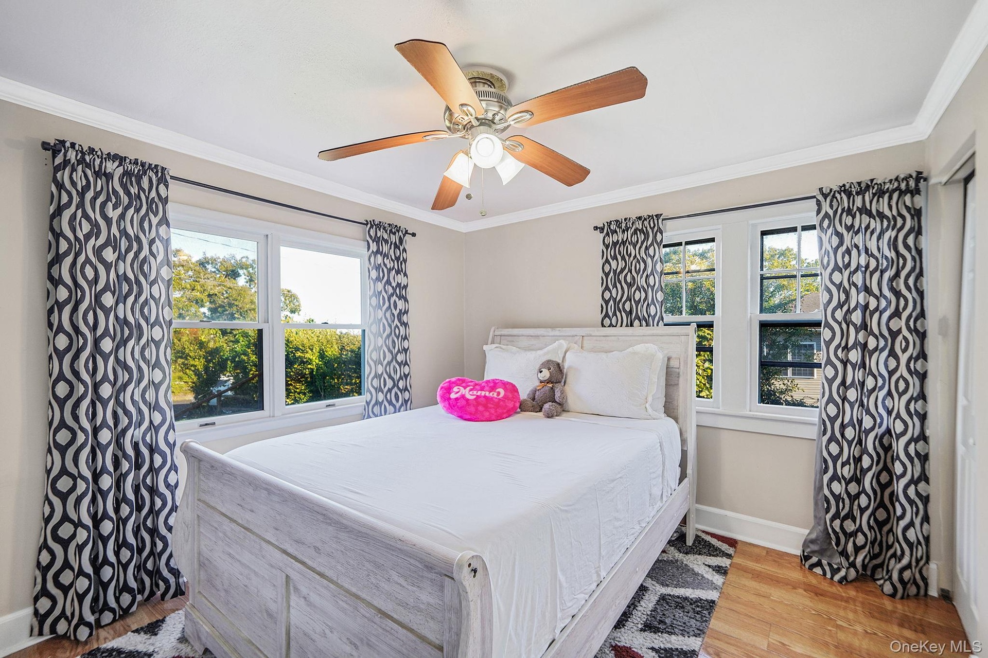 - Bedroom with wood finished floors, crown molding, and ceiling fan